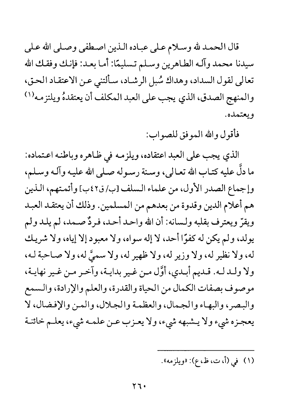 الذي يجب على العبد اعتقاده، ويلزمه في ظاهره وباطنه اعتماده: ما دلَّ عليه كتاب الله تعالى، وسنة رسوله صلى الله عليه وآله وسلم، وإجماع الصدر الأول، من علماء السلف [ب/ ق 42 ب] وأئمتهم، الذين هم أعلام الدين وقدوة من بعدهم من المسلمين. وذلك أن يعتقد العبد ويقرّ ويعترف بقلبه ولسانه: أن الله واحد أحد، فردٌ صمد، لم يلد ولم يولد، ولم يكن له كفوًا أحد، لا إله سواه، ولا معبود إلا إياه، ولا شريك له، ولا نظير له، ولا وزير له، ولا ظهير له، ولا سميَّ له، ولا صاحبة له، ولا ولد له. قديم أبدي، أوَّل من غير بداية، وآخر من غير نهاية، موصوف بصفات الكمال من الحياة والقدرة، والعلم والإرادة، والسمع والبصر، والبهاء والجمال، والعظمة والجلال، والمن والإفضال، لا يعجزه شيء ولا يشبهه شيء، ولا يعزب عن علمه شيء، يعلم خائنة