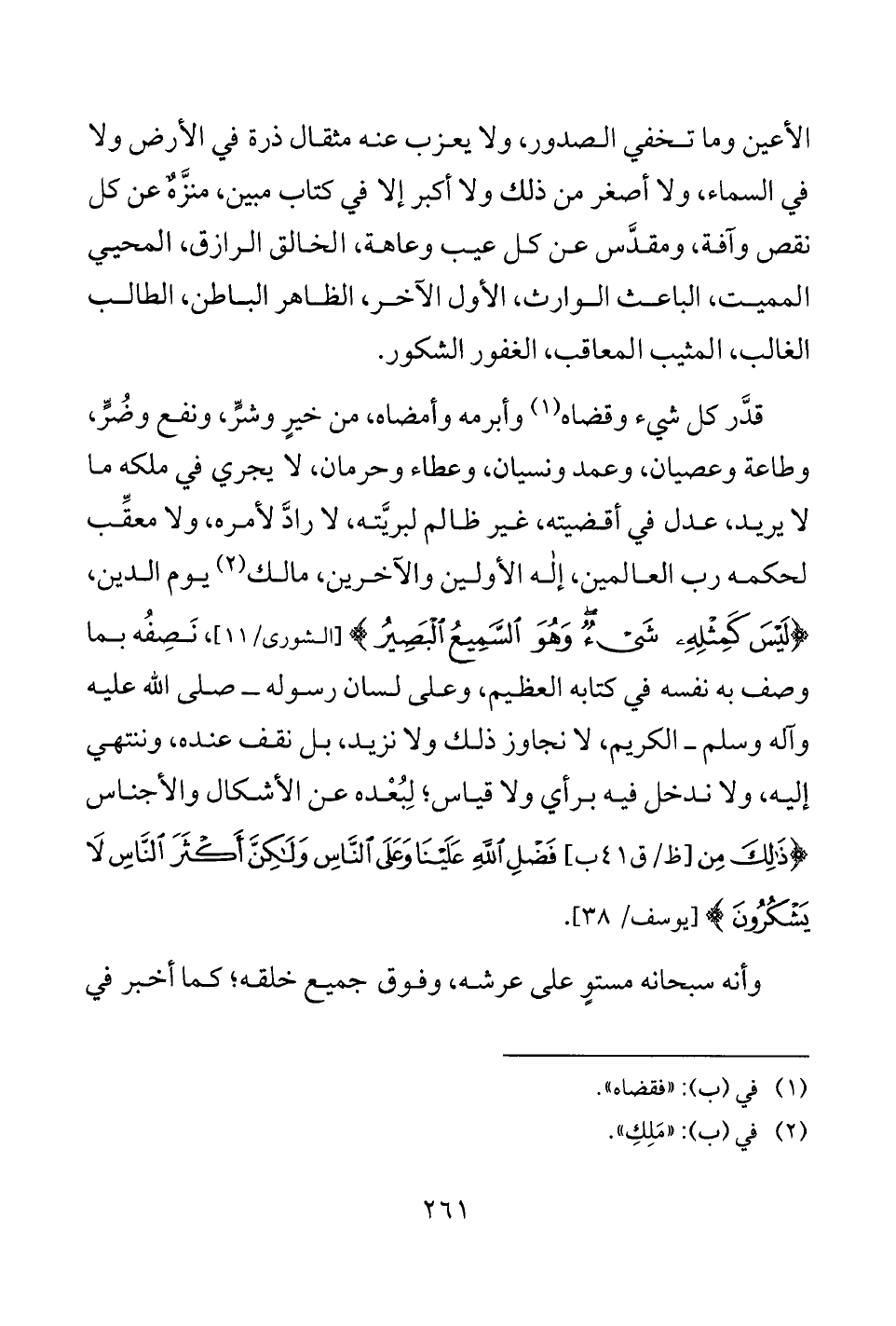 قدَّر كل شيء وقضاه (¬1) وأبرمه وأمضاه، من خيرٍ وشرٍّ، ونفع وضُرٍّ، وطاعة وعصيان، وعمد ونسيان، وعطاء وحرمان، لا يجري في ملكه ما لا يريد، عدل في أقضيته، غير ظالم لبريَّته، لا رادَّ لأمره، ولا معقِّب لحكمه رب العالمين، إله الأولين والآخرين، مالك (¬2) يوم الدين، {لَيْسَ كَمِثْلِهِ شَيْءٌ وَهُوَ السَّمِيعُ الْبَصِيرُ} [الشورى: 11]، نَصِفُه بما وصف به نفسه في كتابه العظيم، وعلى لسان رسوله- صلى الله عليه وآله وسلم- الكريم، لا نجاوز ذلك ولا نزيد، بل نقف عنده، وننتهي إليه، ولا ندخل فيه برأي ولا قياس؛ لِبُعْده عن الأشكال والأجناس {ذَلِكَ مِنْ [ظ/ ق 41 ب] فَضْلِ اللَّهِ عَلَيْنَا وَعَلَى النَّاسِ وَلَكِنَّ أَكْثَرَ النَّاسِ لَا يَشْكُرُونَ} [يوسف: 38].