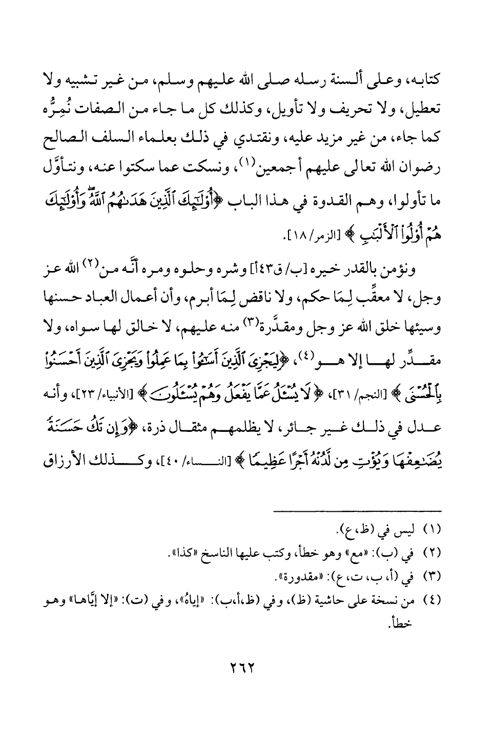 ونؤمن بالقدر خيره [ب/ ق 43 أ] وشره وحلوه ومره أنَّه من (¬2) الله عز وجل، لا معقب لِمَا حكم، ولا ناقض لِمَا أبرم، وأن أعمال العباد حسنها وسيئها خلق الله عز وجل ومقدَّرة (¬3) منه عليهم، لا خالق لها سواه، ولا مقدِّر لها إلا هو (¬4)، {لِيَجْزِيَ الَّذِينَ أَسَاءُوا بِمَا عَمِلُوا وَيَجْزِيَ الَّذِينَ أَحْسَنُوا بِالْحُسْنَى} [النجم: 31] {لَا يُسْأَلُ عَمَّا يَفْعَلُ وَهُمْ يُسْأَلُونَ} [الأنبياء: 23]، وأنه عدل في ذلك غير جائر، لا يظلمهم مثقال ذرة، {وَإِنْ تَكُ حَسَنَةً يُضَاعِفْهَا وَيُؤْتِ مِنْ لَدُنْهُ أَجْرًا عَظِيمًا} [النساء: 40]، وكذلك الأرزاق