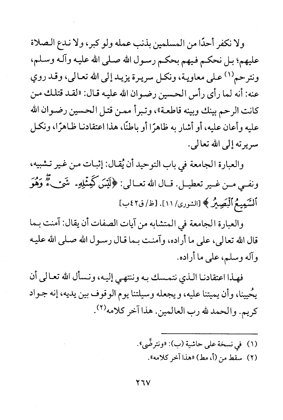 فهذا اعتقادنا الذي نتمسك به وننتهي إليه، ونسأل الله تعالى أن يحُيينا، وأن يميتنا عليه، ويجعله وسيلتنا يوم الوقوف بين يديه، إنه جواد كريم. والحمد لله رب العالمين. هذا آخر كلامه (¬2).
