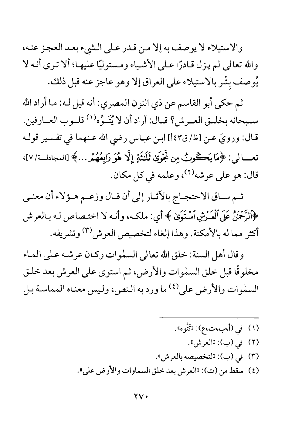 ثم حكى أبو القاسم عن ذي النون المصري: أنه قيل له: ما أراد الله سبحانه بخلق العرش؟ قال: أراد أن لا يُتَوِّه (¬1) قلوب العارفين. قال: ورويَ عن [ظ/ ق 43 أ] ابن عباس رضي الله عنهما في تفسير قوله تعالى: {مَا يَكُونُ مِنْ نَجْوَى ثَلَاثَةٍ إِلَّا هُوَ رَابِعُهُمْ ...} [المجادلة: 7]، قال: هو على عرشه (¬2)، وعلمه في كل مكان.