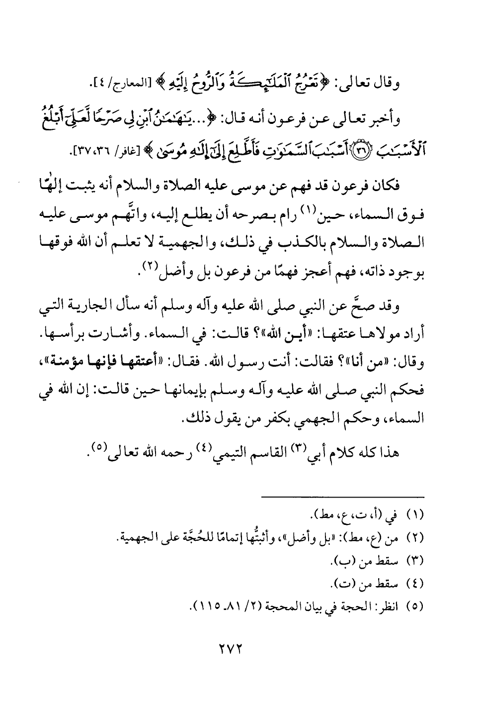 وقد صحَّ عن النبي صلى الله عليه وآله وسلم أنه سأل الجارية التي أراد مولاها عتقها: "أين الله"؟ قالت: في السماء. وأشارت برأسها. وقال: "من أنا"؟ فقالت: أنت رسول الله. فقال: "أعتقها فإنها مؤمنة"، فحكم النبي صلى الله عليه وآله وسلم بإيمانها حين قالت: إن الله في السماء، وحكم الجهمي بكفر من يقول ذلك.
