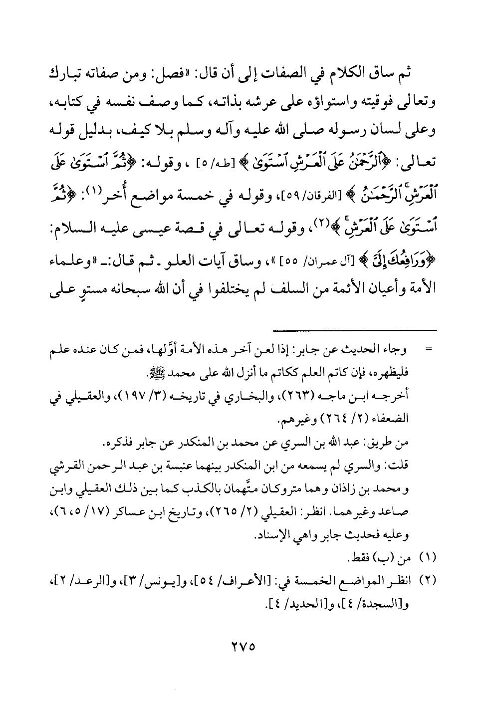 ثم ساق الكلام في الصفات إلى أن قال: "فصل: ومن صفاته تبارك وتعالى فوقيته واستواؤه على عرشه بذاته، كما وصف نفسه في كتابه، وعلى لسان رسوله صلى الله عليه وآله وسلم بلا كيف، بدليل قوله تعالى: {الرَّحْمَنُ عَلَى الْعَرْشِ اسْتَوَى} [طه: 5]، وقوله: {ثُمَّ اسْتَوَى عَلَى الْعَرْشِ الرَّحْمَنُ} [الفرقان: 59]، وقوله في خمسة مواضع أُخر (¬1): {ثُمَّ اسْتَوَى عَلَى الْعَرْشِ} (¬2)، وقوله تعالى في قصة عيسى عليه السلام: {وَرَافِعُكَ إِلَيَّ} [آل عمران: 55] "، وساق آيات العلو - ثم قال: - "وعلماء الأمة وأعيان الأئمة من السلف لم يختلفوا في أن الله سبحانه مستوٍ على