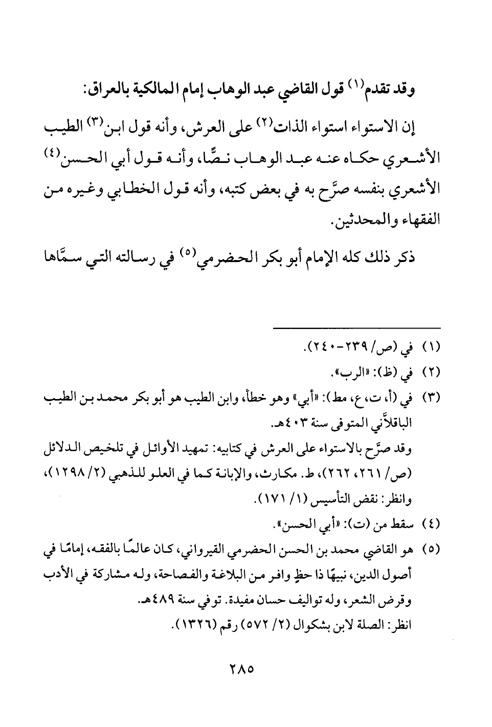 إن الاستواء استواء الذات (¬2) على العرش، وأنه قول ابن (¬3) الطيب الأشعري حكاه عنه عبد الوهاب نصًّا، وأنه قول أبي الحسن (¬4) الأشعري بنفسه صرَّح به في بعض كتبه، وأنه قول الخطابي وغيره من الفقهاء والمحدثين.