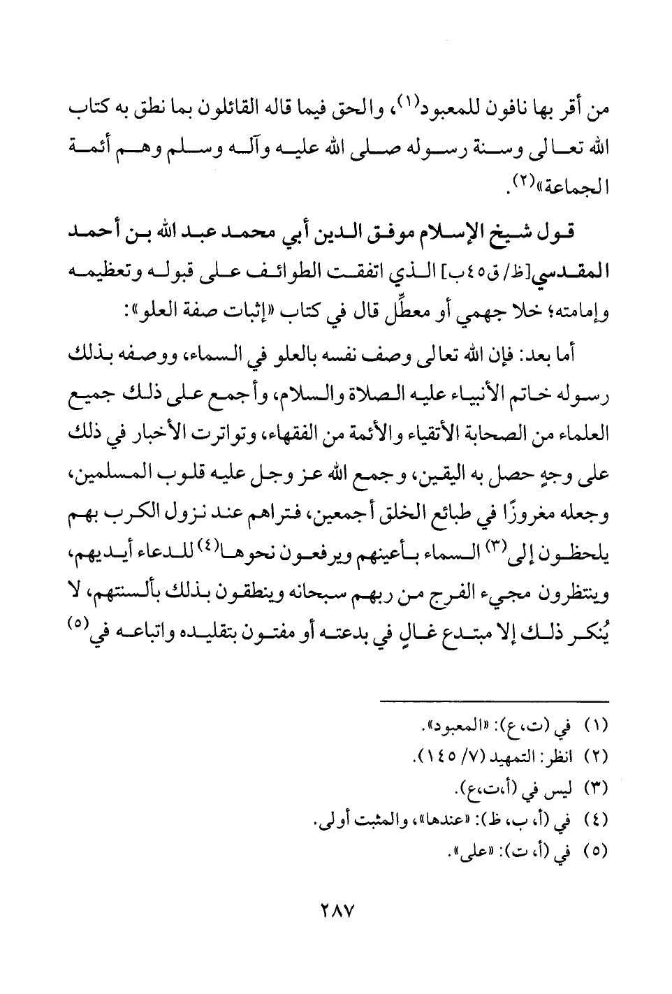 قول شيخ الإسلام موفق الدين أبي محمد عبد الله بن أحمد المقدسي [ظ/ ق 45 ب] الذي اتفقت الطوائف على قبوله وتعظيمه وإمامته، خلا جهمي أو معطِّل قال في كتاب "إثبات صفة العلو":