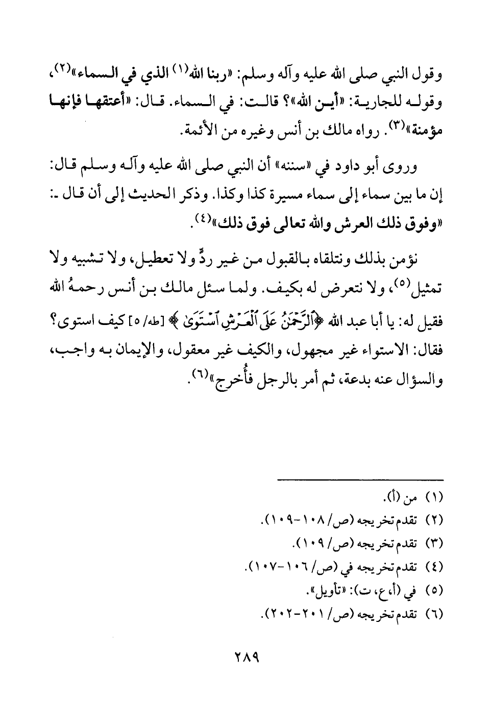نؤمن بذلك ونتلقاه بالقبول من غير ردٍّ ولا تعطيل، ولا تشبيه ولا تمثيل (¬5)، ولا نتعرض له بكيف. ولما سئل مالك بن أنس رحمهُ الله فقيل له: يا أبا عبد الله {الرَّحْمَنُ عَلَى الْعَرْشِ اسْتَوَى} [طه: 5] كيف استوى؟ فقال: الاستواء غير مجهول، والكيف غير معقول، والإيمان به واجب، والسؤال عنه بدعة، ثم أمر بالرجل فأُخرج" (¬6).