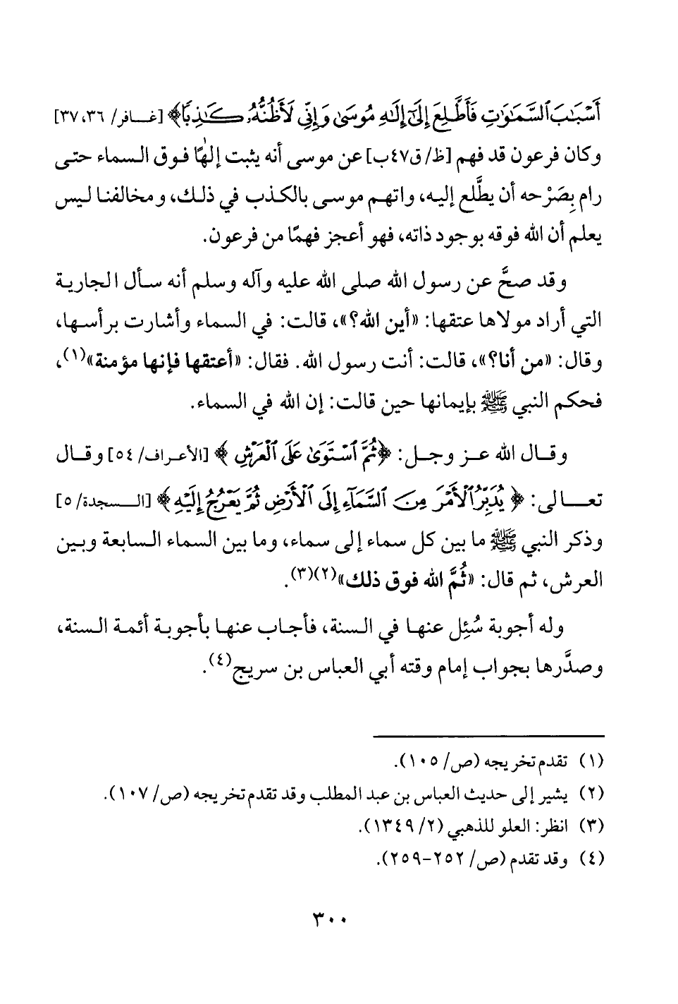 وقد صحَّ عن رسول الله صلى الله عليه وآله وسلم أنه سأل الجارية التي أراد مولاها عتقها: "أين الله؟ "، قالت: في السماء وأشارت برأسها، وقال: "من أنا؟ "، قالت: أنت رسول الله. فقال: "أعتقها فإنها مؤمنة" (¬1)، فحكم النبي - صلى الله عليه وسلم - بإيمانها حين قالت: إن الله في السماء.