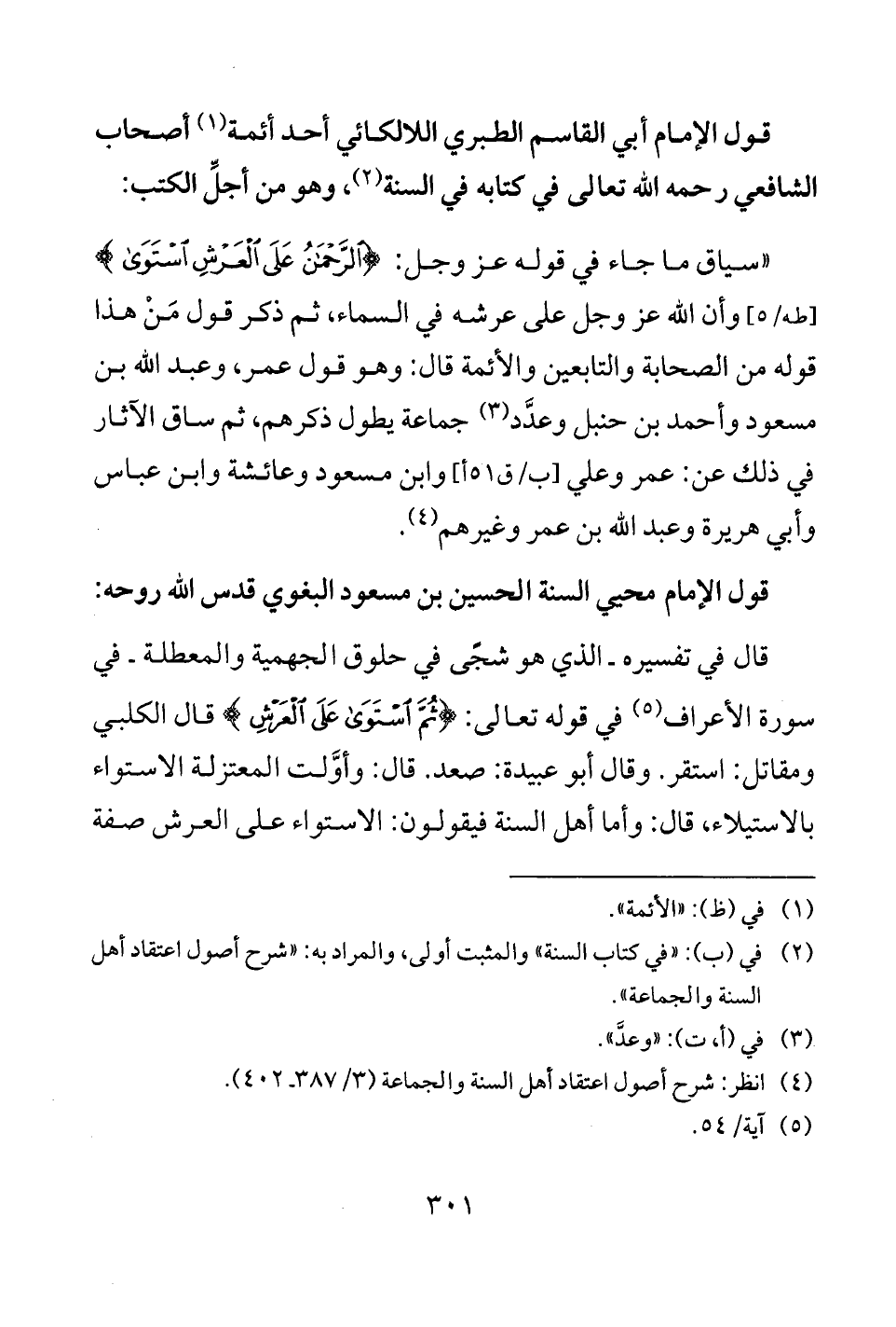 قول الإمام أبي القاسم الطبري اللالكائي أحد أئمة (¬1) أصحاب الشافعي رحمه الله تعالى في كتابه في السنة (¬2)، وهو من أجلِّ الكتب: