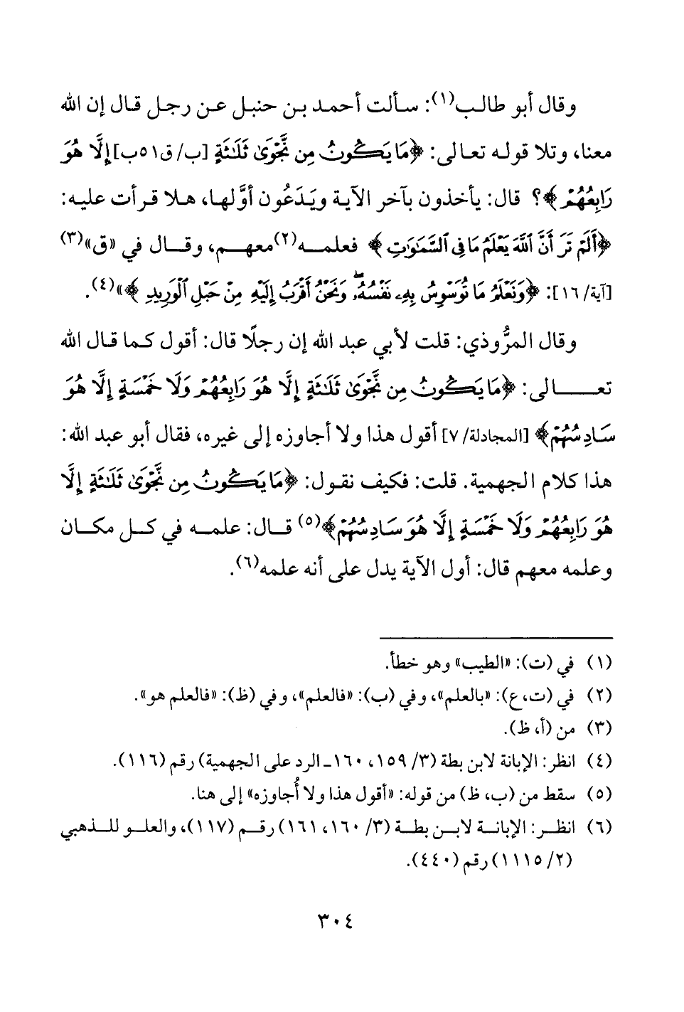 وقال المرُّوذي: قلت لأبي عبد الله إن رجلًا قال: أقول كما قال الله تعالى: {مَا يَكُونُ مِنْ نَجْوَى ثَلَاثَةٍ إِلَّا هُوَ رَابِعُهُمْ وَلَا خَمْسَةٍ إِلَّا هُوَ سَادِسُهُمْ} [المجادلة: 7] أقول هذا ولا أجاوزه إلى غيره، فقال أبو عبد الله: هذا كلام الجهمية. قلت: فكيف نقول: {مَا يَكُونُ مِنْ نَجْوَى ثَلَاثَةٍ إِلَّا هُوَ رَابِعُهُمْ وَلَا خَمْسَةٍ إِلَّا هُوَ سَادِسُهُمْ} (¬5) قال: علمه في كل مكان وعلمه معهم قال: أول الآية يدل على أنه علمه (¬6).