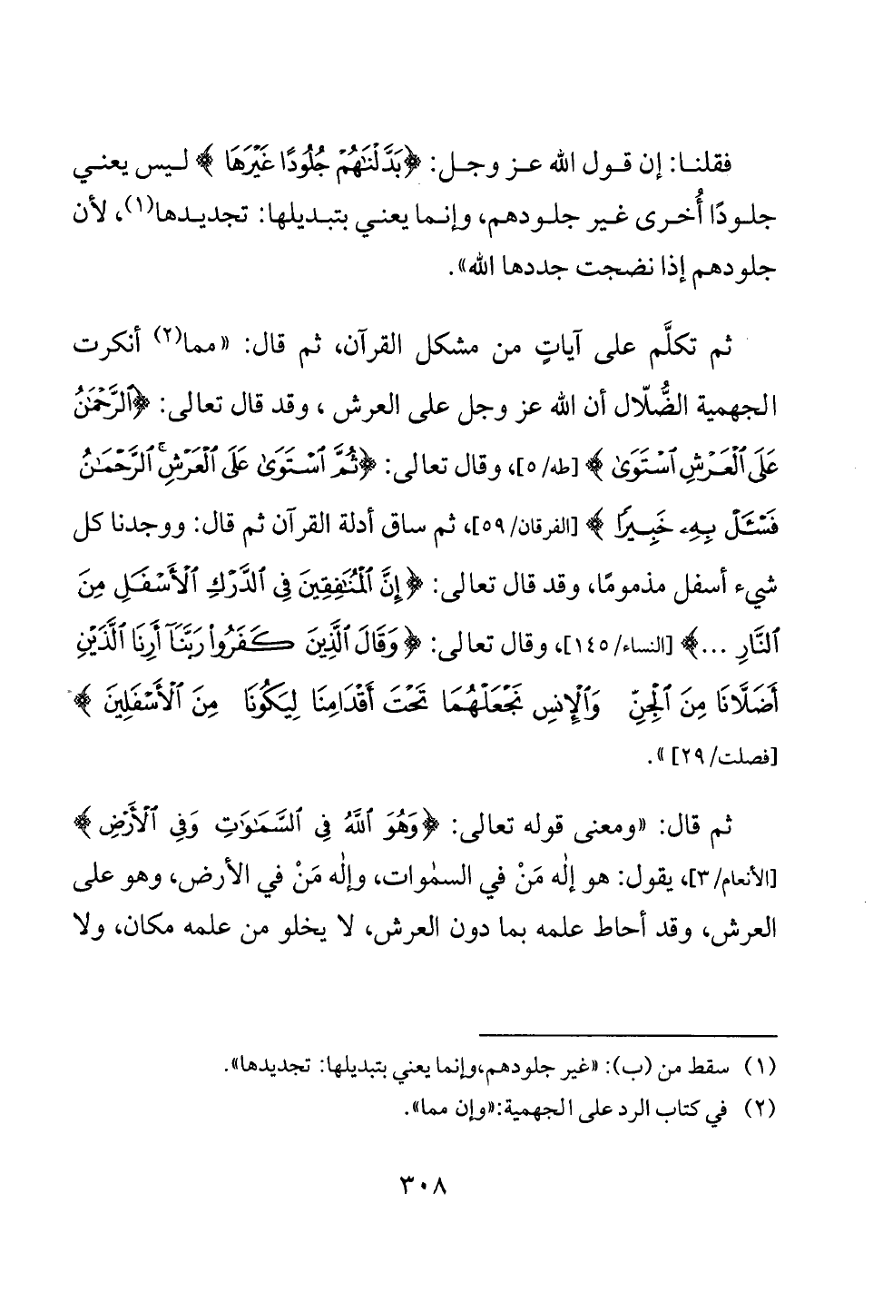 ثم تكلَّم على آياتٍ من مشكل القرآن، ثم قال: "مما (¬2) أنكرت الجهمية الضُّلّال أن الله عز وجل على العرش، وقد قال تعالى: {الرَّحْمَنُ عَلَى الْعَرْشِ اسْتَوَى} [طه: 5]، وقال تعالى: {ثُمَّ اسْتَوَى عَلَى الْعَرْشِ الرَّحْمَنُ فَاسْأَلْ بِهِ خَبِيرًا} [الفرقان: 59]، ثم ساق أدلة القرآن ثم قال: ووجدنا كل شيء أسفل مذمومًا، وقد قال تعالى: {إِنَّ الْمُنَافِقِينَ فِي الدَّرْكِ الْأَسْفَلِ مِنَ النَّارِ ...} [النساء: 145]، وقال تعالى: {وَقَالَ الَّذِينَ كَفَرُوا رَبَّنَا أَرِنَا اللَّذَيْنِ أَضَلَّانَا مِنَ الْجِنِّ وَالْإِنْسِ نَجْعَلْهُمَا تَحْتَ أَقْدَامِنَا لِيَكُونَا مِنَ الْأَسْفَلِينَ} [فصلت: 29] ".
