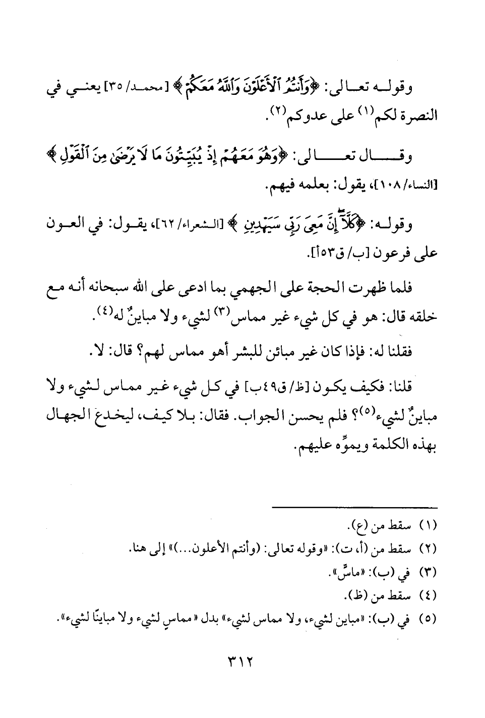 قلنا: فكيف يكون [ظ/ ق 49 ب] في كل شيء غير مماس لشيء ولا مباينٌ لشيء (¬5)؟ فلم يحسن الجواب. فقال: بلا كيف، ليخدع الجهال بهذه الكلمة ويموِّه عليهم.