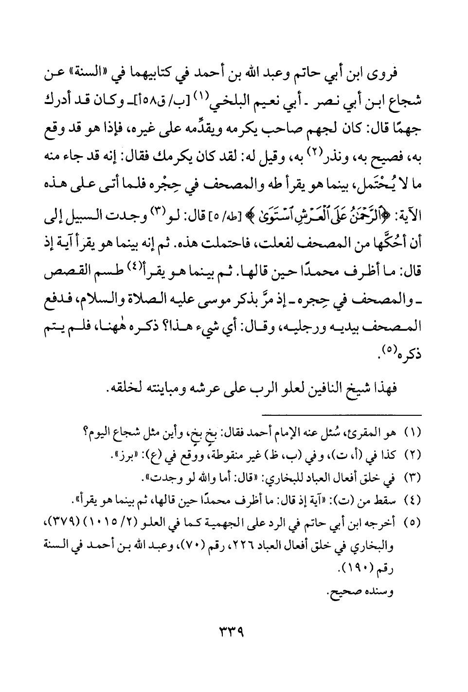 فروى ابن أبي حاتم وعبد الله بن أحمد في كتابيهما في "السنة" عن شجاع ابن أبي نصر - أبي نعيم البلخي (¬1) [ب/ ق 58 أ]- وكان قد أدرك جهمًا قال: كان لجهم صاحب يكرمه ويقدِّمه على غيره، فإذا هو قد وقع به، فصيح به، ونذر (¬2) به، وقيل له: لقد كان يكرمك فقال: إنه قد جاء منه ما لا يُحْتَمل، بينما هو يقرأ طه والمصحف في حِجْره فلما أتى على هذه الآية: {الرَّحْمَنُ عَلَى الْعَرْشِ اسْتَوَى} [طه: 5] قال: لو (¬3) وجدت السبيل إلى أن أحُكَّها من المصحف لفعلت، فاحتملت هذه. ثم إنه بينما هو يقرأ آية إذ قال: ما أظرف محمدًا حين قالها. ثم بينما هو يقرأ (¬4) طسم القصص -والمصحف في حِجره- إذ مرَّ بذكر موسى عليه الصلاة والسلام، فدفع المصحف بيديه ورجليه، وقال: أي شيء هذا؟ ذكره ههنا، فلم يتم ذكره (¬5).
