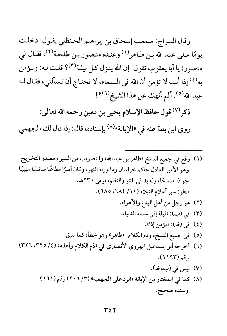 وقال السراج: سمعت إسحاق بن إبراهيم الحنظلي يقول: دخلت يومًا على عبد الله بن طاهر (¬1) وعنده منصور بن طلحة (¬2)، فقال لي منصور: يا أبا يعقوب تقول: إن الله ينزل كل ليلة (¬3)؟ قلت له: ونؤمن به (¬4) إذا أنت لا تؤمن أن الله في السماء، لا تحتاج أن تسألني، فقال له عبد الله (¬5). ألم أنهك عن هذا الشيخ (¬6)؟!