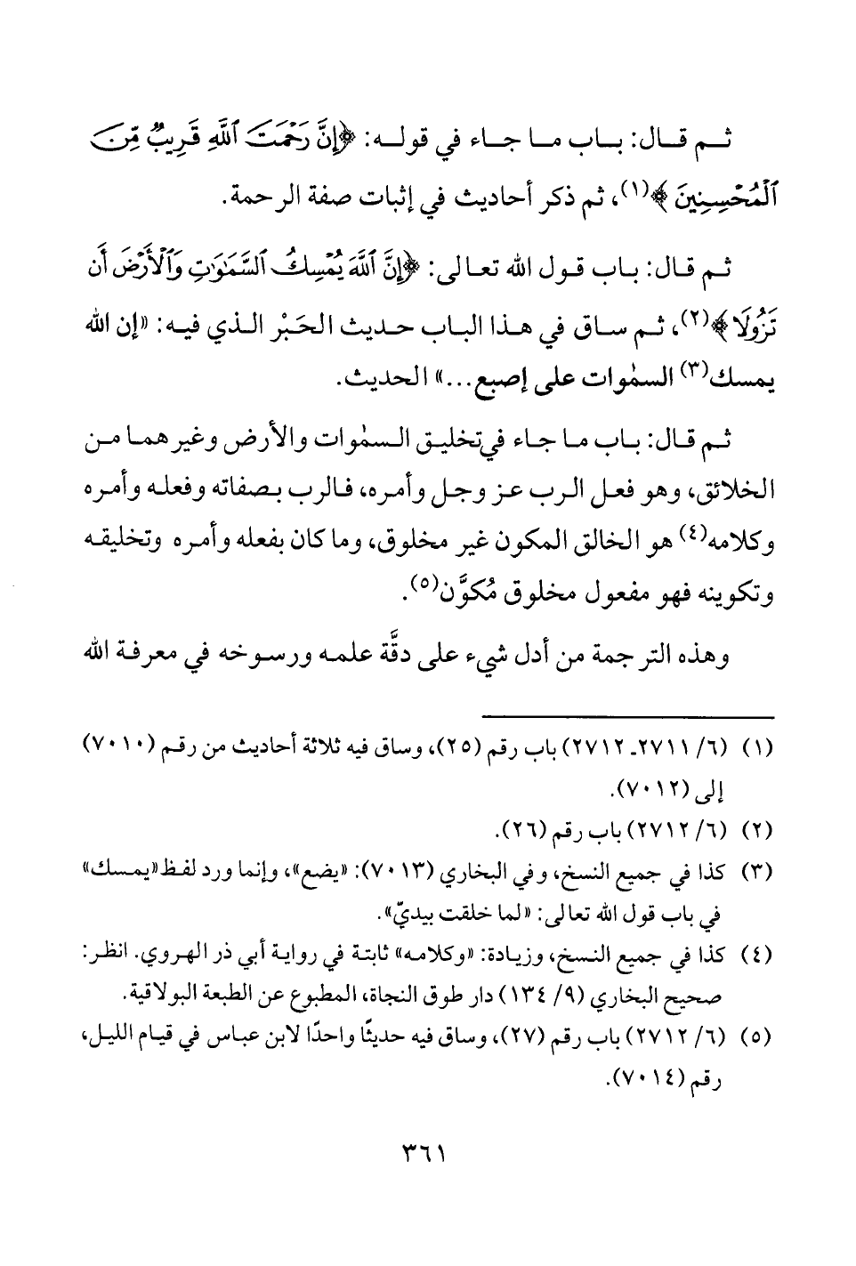 ثم قال: باب قول الله تعالى: {إِنَّ اللَّهَ يُمْسِكُ السَّمَاوَاتِ وَالْأَرْضَ أَنْ تَزُولَا} (¬2)، ثم ساق في هذا الباب حديث الحَبْر الذي فيه: "إن الله يمسك (¬3) السموات على إصبع ... " الحديث.