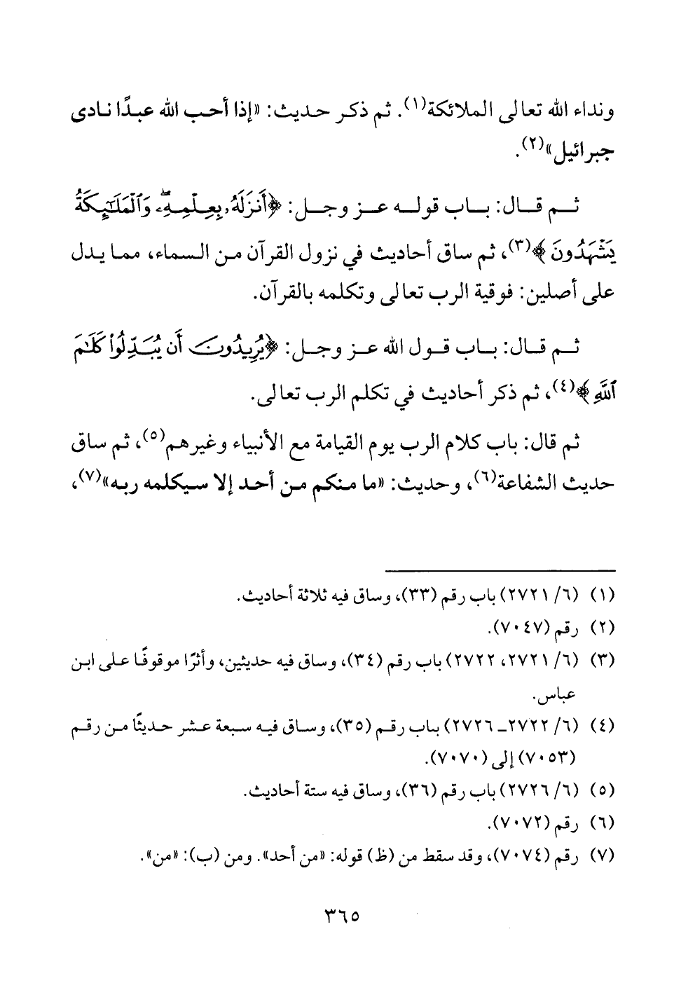 (¬4) (6/ 2722 - 2726) باب رقم (35)، وساق فيه سبعة عشر حديثًا من رقم (7053) إلى (7070).