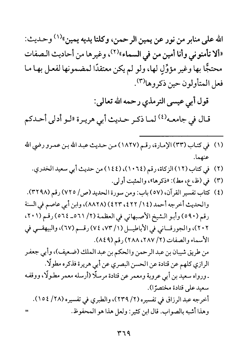 الله على منابر من نور عن يمين الرحمن، وكلتا يديه يمين" (¬1) وحديث: "ألا تأمنوني وأنا أمين من في السماء" (¬2)، وغيرها من أحاديث الصفات محتجًّا بها وغير مؤوِّلٍ لها، ولو لم يكن معتقدًا لمضمونها لفعل بها ما فعل المتأولون حين ذكروها (¬3).