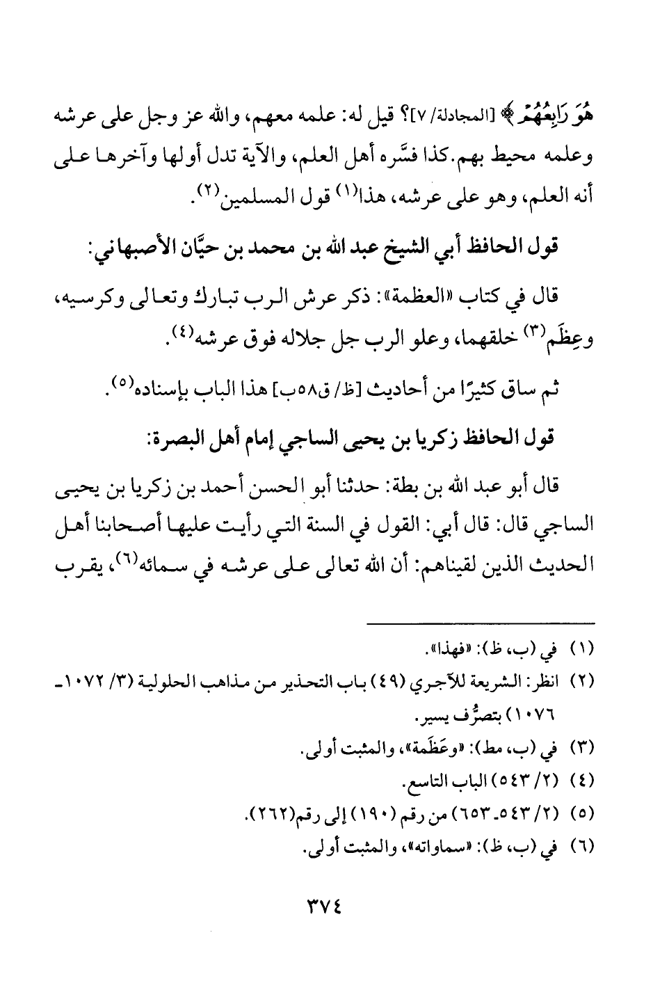 قال أبو عبد الله بن بطة: حدثنا أبو الحسن أحمد بن زكريا بن يحيى الساجي قال: قال أبي: القول في السنة التي رأيت عليها أصحابنا أهل الحديث الذين لقيناهم: أن الله تعالى على عرشه في سمائه (¬6)، يقرب