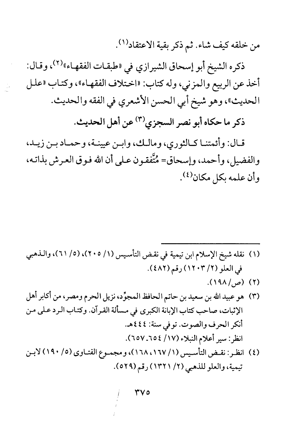 (¬4) انظر: نقض التأسيس (1/ 167، 168)، ومجموع الفتاوى (5/ 190) لابن تيمية، والعلو للذهبي (2/ 1321) رقم (529).