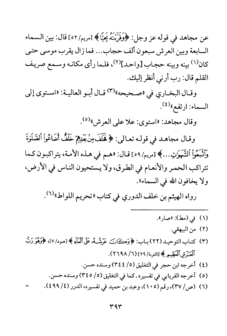 عن مجاهد في قوله عز وجل: {وَقَرَّبْنَاهُ نَجِيًّا} [مريم/ 52] قال: بين السماء السابعة وبين العرش سبعون ألف حجاب ... فما زال يقرب موسى حتى كان (¬1) بينه وبينه حجاب [واحد] (¬2)، فلما رأى مكانه وسمع صريف القلم قال: رب أرني أنظر إليك.