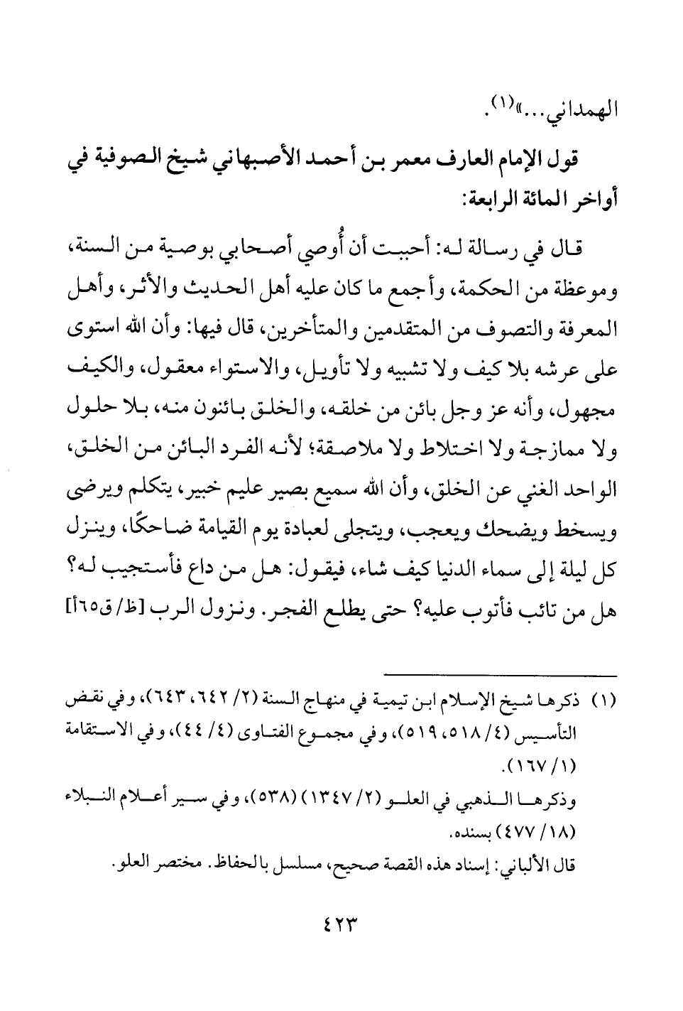 قول الإمام العارف معمر بن أحمد الأصبهاني شيخ الصوفية في أواخر المائة الرابعة: