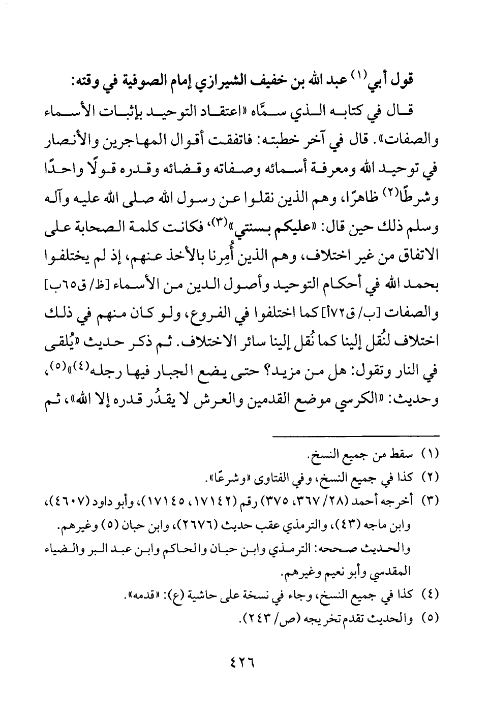 قال في كتابه الذي سمَّاه "اعتقاد التوحيد بإثبات الأسماء والصفات". قال في آخر خطبته: فاتفقت أقوال المهاجرين والأنصار في توحيد الله ومعرفة أسمائه وصفاته وقضائه وقدره قولًا واحدًا وشرطًا (¬2) ظاهرًا، وهم الذين نقلوا عن رسول الله صلى الله عليه وآله وسلم ذلك حين قال: "عليكم بسنتي" (¬3)، فكانت كلمة الصحابة على الاتفاق من غير اختلاف، وهم الذين أُمِرنا بالأخذ عنهم، إذ لم يختلفوا بحمد الله في أحكام التوحيد وأصول الدين من الأسماء [ظ/ ق 65 ب] والصفات [ب/ ق 72 أ]، كما اختلفوا في الفروع، ولو كان منهم في ذلك اختلاف لنُقل إلينا كما نُقل إلينا سائر الاختلاف. ثم ذكر حديث "يُلقى في النار وتقول: هل من مزيد؟ حتى يضع الجبار فيها رجله (¬4) " (¬5)، وحديث: "الكرسي موضع القدمين والعرش لا يقدُر قدره إلا الله"، ثم