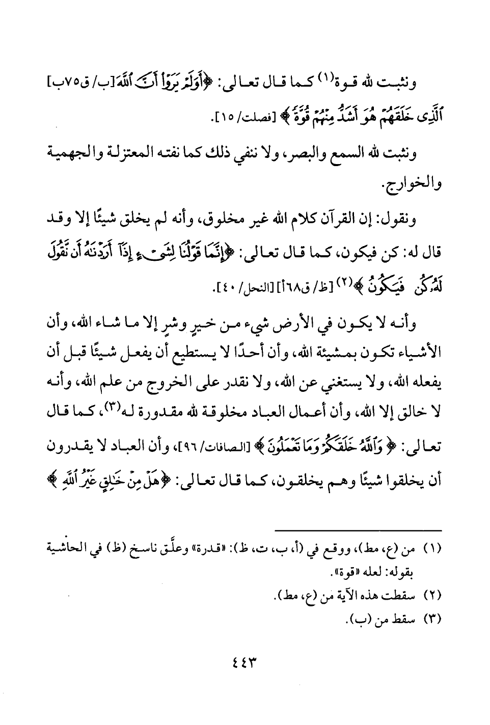 ونثبت لله قوة (¬1) كما قال تعالى: {أَوَلَمْ يَرَوْا أَنَّ اللَّهَ [ب/ق 75 ب] الَّذِي خَلَقَهُمْ هُوَ أَشَدُّ مِنْهُمْ قُوَّةً} [فصلت: 15].