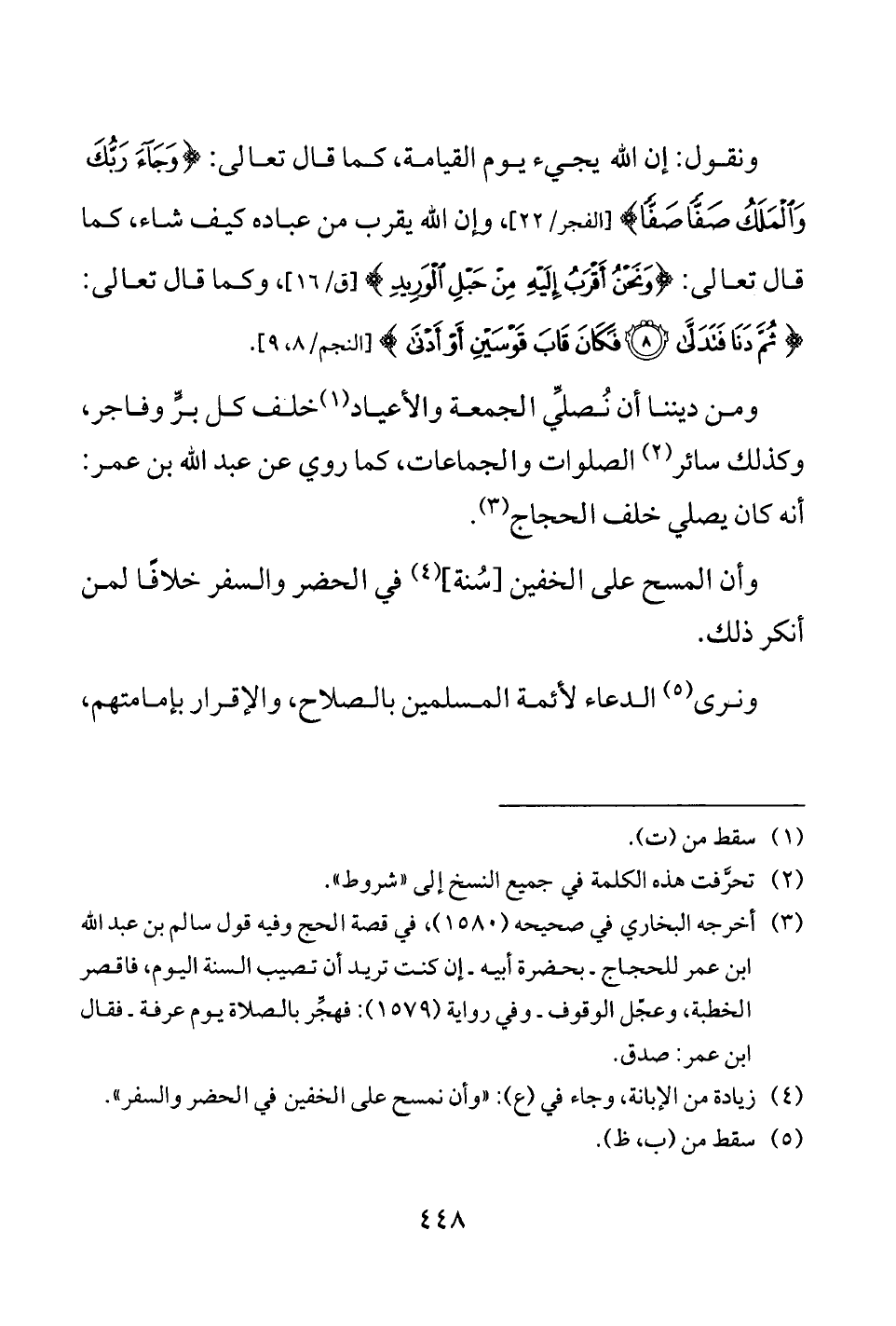 ونقول: إن الله يجيء يوم القيامة، كما قال تعالى: {وَجَاءَ رَبُّكَ وَالْمَلَكُ صَفًّا صَفًّا} [الفجر: 22]، وإن الله يقرب من عباده كيف شاء، كما قال تعالى: {وَنَحْنُ أَقْرَبُ إِلَيْهِ مِنْ حَبْلِ الْوَرِيدِ} [ق: 16]، وكما قال تعالى: {ثُمَّ دَنَا فَتَدَلَّى (8) فَكَانَ قَابَ قَوْسَيْنِ أَوْ أَدْنَى} [النجم: 8 - 9].