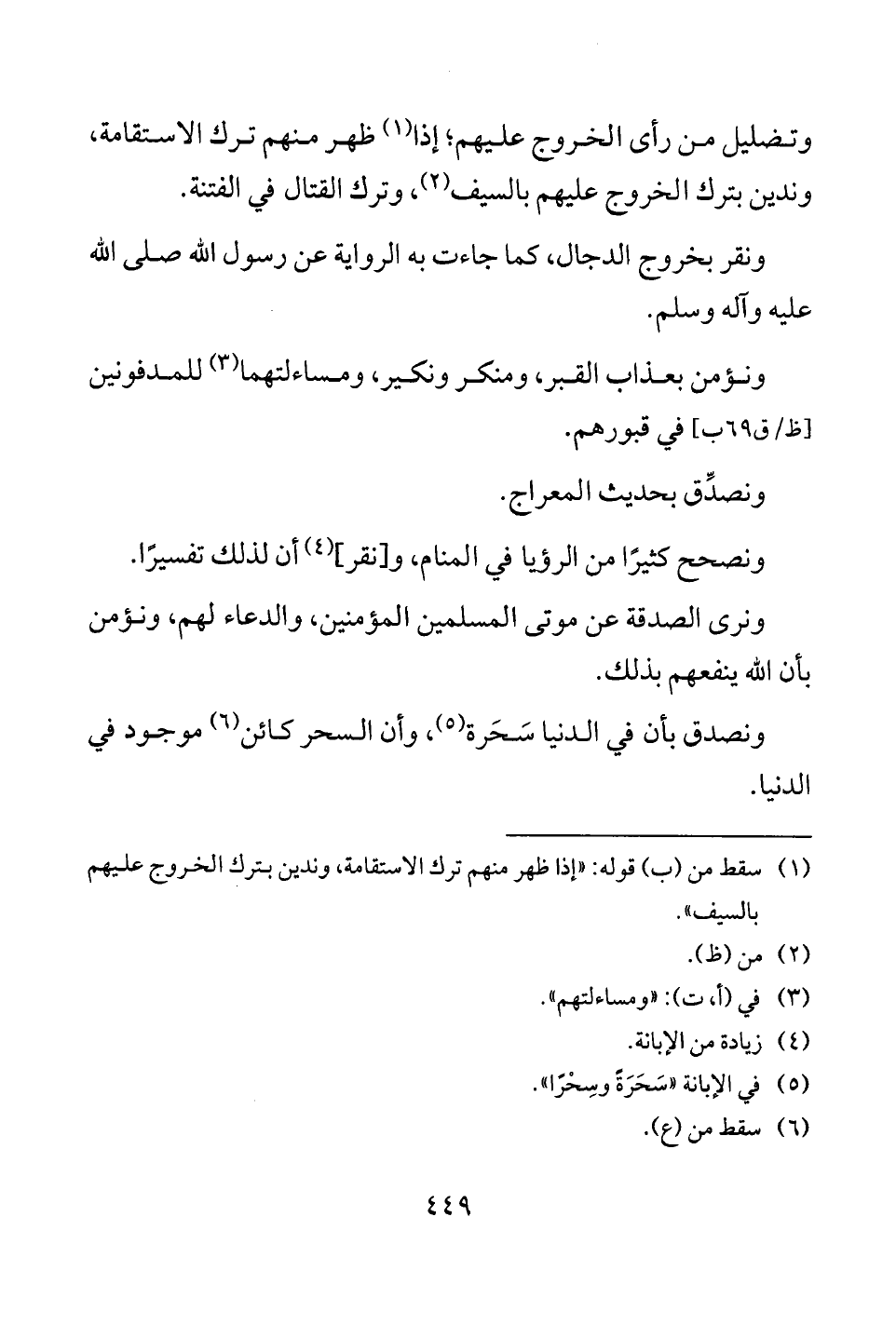 (¬1) سقط من (ب) قوله: "إذا ظهر منهم ترك الاستقامة، وندين بترك الخروج عليهم بالسيف".
