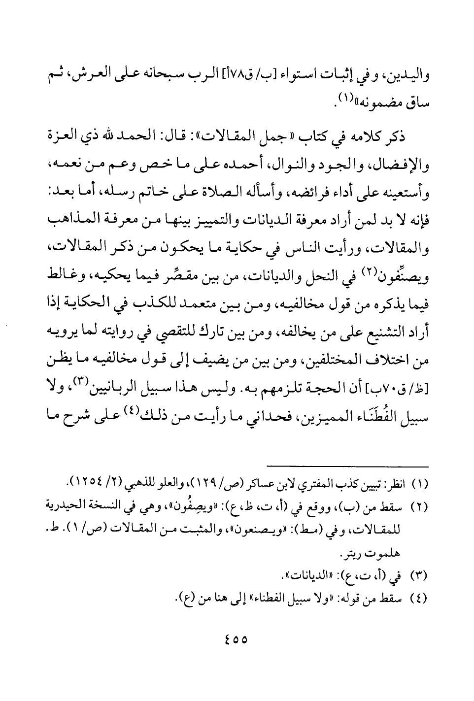 (¬2) سقط من (ب)، ووقع في (أ، ت، ظ، ع): "ويصِفُون"، وهي في النسخة الحيدرية للمقالات، وفي (مط): "ويصنعون"، والمثبت من المقالات (ص/ 1). ط. هلموت ريتر.