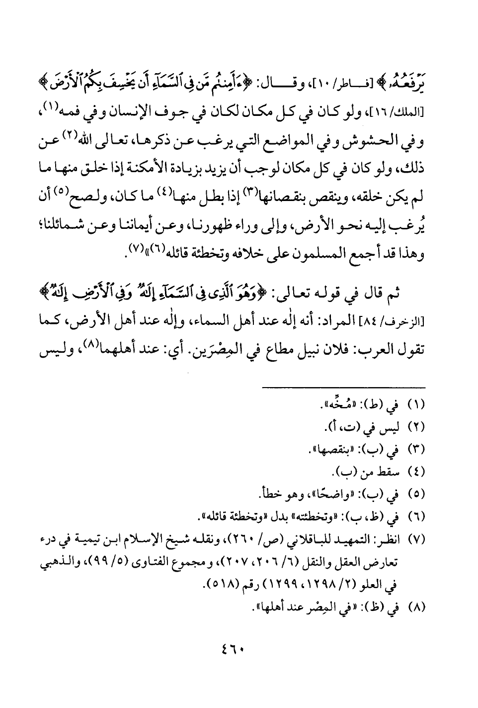 (¬7) انظر: التمهيد للباقلاني (ص/ 260)، ونقله شيخ الإسلام ابن تيمية في درء تعارض العقل والنقل (6/ 206، 207)، ومجموع الفتاوى (5/ 99)، والذهبي في العلو (2/ 1298، 1299) رقم (518).
