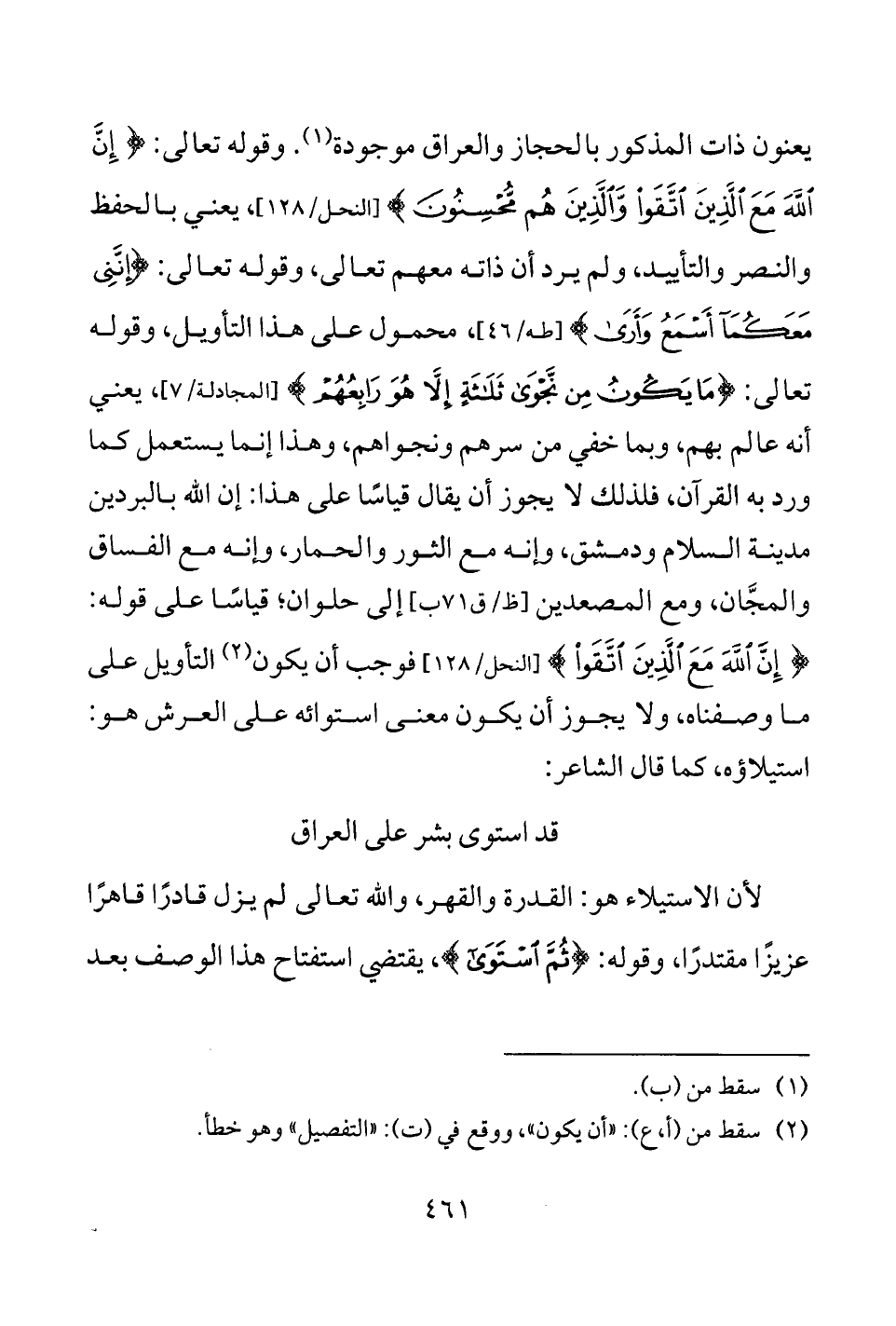 يعنون ذات المذكور بالحجاز والعراق موجودة (¬1). وقوله تعالى: {إِنَّ اللَّهَ مَعَ الَّذِينَ اتَّقَوْا وَالَّذِينَ هُمْ مُحْسِنُونَ} [النحل: 128]، يعني بالحفظ والنصر والتأييد، ولم يرد أن ذاته معهم تعالى، وقوله تعالى: {إِنَّنِي مَعَكُمَا أَسْمَعُ وَأَرَى} [طه: 46]، محمول على هذا التأويل، وقوله تعالى: {مَا يَكُونُ مِنْ نَجْوَى ثَلَاثَةٍ إِلَّا هُوَ رَابِعُهُمْ} [المجادلة: 7]، يعني أنه عالم بهم، وبما خفي من سرهم ونجواهم، وهذا إنما يستعمل كما ورد به القرآن، فلذلك لا يجوز أن يقال قياسًا على هذا: إن الله بالبردين مدينة السلام ودمشق، وإنه مع الثور والحمار، وإنه مع الفساق والمجَّان، ومع المصعدين [ظ/ ق 71 ب] إلى حلوان؛ قياسًا على قوله: {إِنَّ اللَّهَ مَعَ الَّذِينَ اتَّقَوْا} [النحل: 128] فوجب أن يكون (¬2) التأويل على ما وصفناه، ولا يجوز أن يكون معنى استوائه على العرش هو: استيلاؤه، كما قال الشاعر: