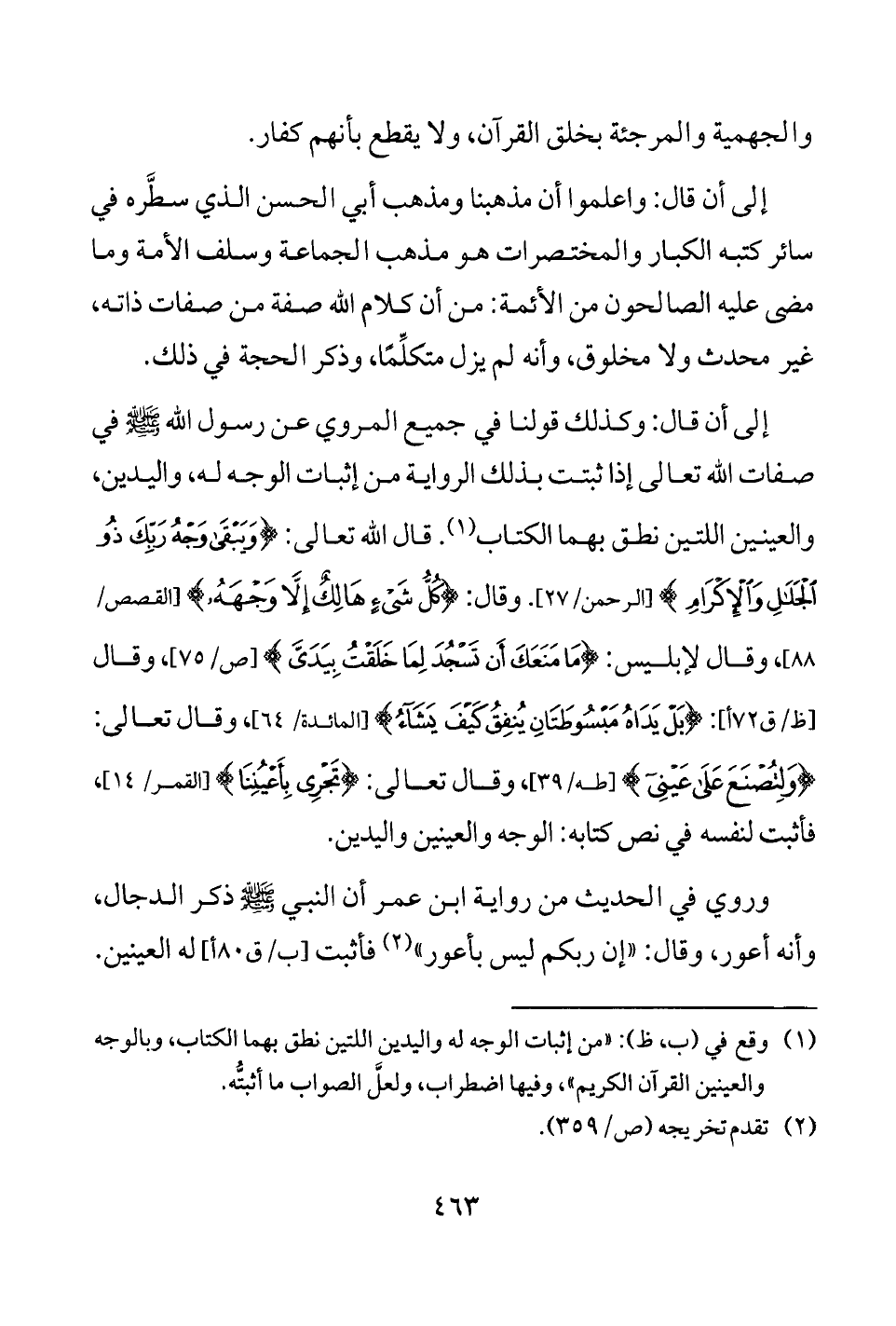 (¬1) وقع في (ب، ظ): "من إثبات الوجه له واليدين اللتين نطق بهما الكتاب، وبالوجه والعينين القرآن الكريم"، وفيها اضطراب، ولعل الصواب ما أثبتُّه.