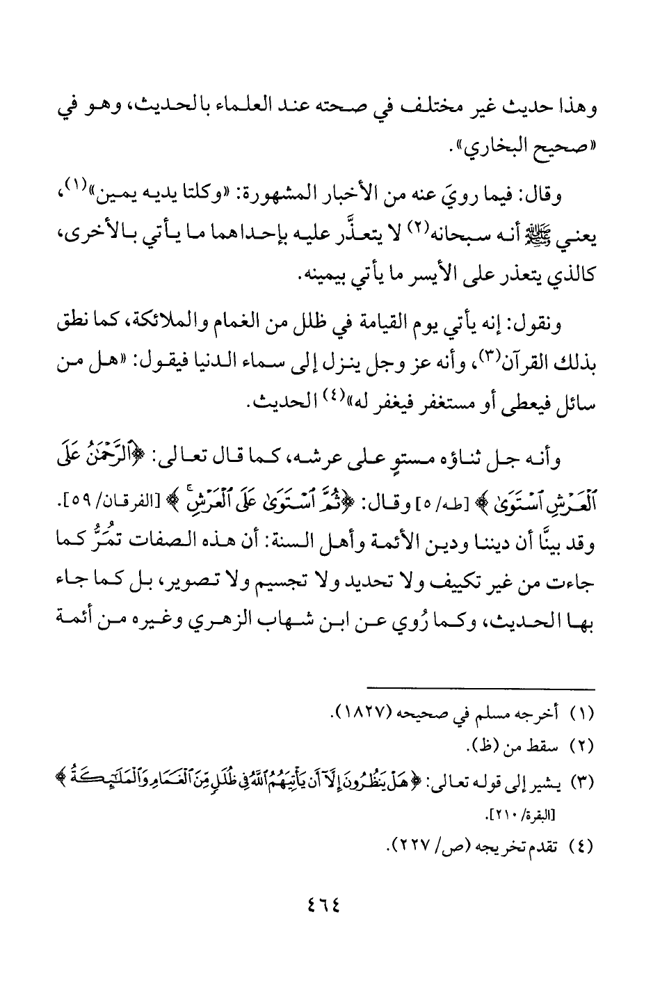 وأنه جل ثناؤه مستوٍ على عرشه، كما قال تعالى: {الرَّحْمَنُ عَلَى الْعَرْشِ اسْتَوَى} [طه: 5] وقال: {ثُمَّ اسْتَوَى عَلَى الْعَرْشِ} [الفرقان: 59]. وقد بينَّا أن ديننا ودين الأئمة وأهل السنة: أن هذه الصفات تمُرُّ كما جاءت من غير تكييف ولا تحديد ولا تجسيم ولا تصوير، بل كما جاء بها الحديث، وكما رُوي عن ابن شهاب الزهري وغيره من أئمة