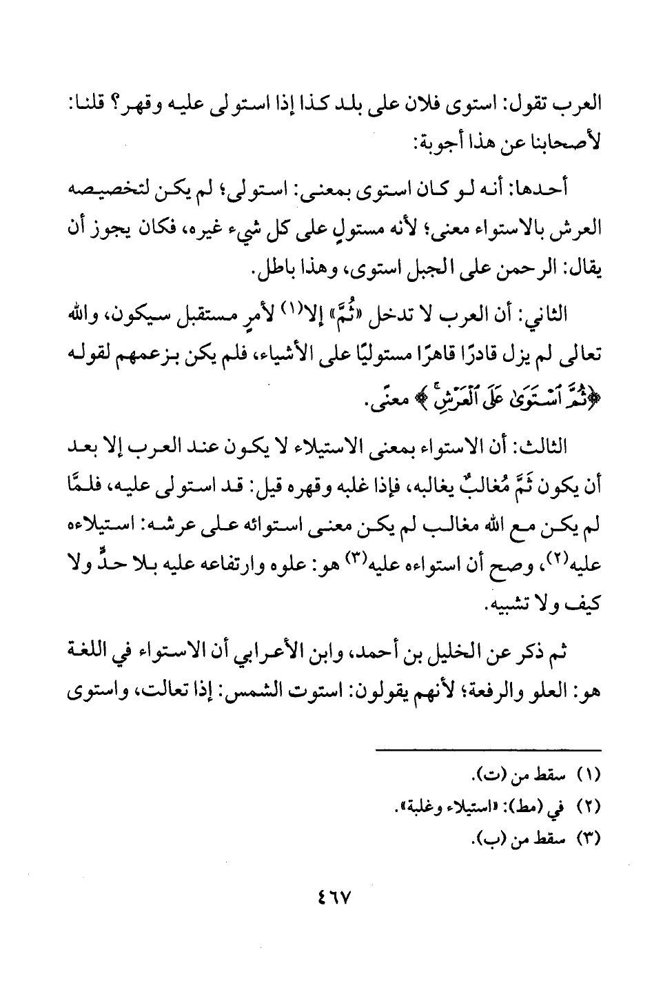 أحدها: أنه لو كان استوى بمعنى: استولى؛ لم يكن لتخصيصه العرش بالاستواء معنى؛ لأنه مستولٍ على كل شيء غيره، فكان يجوز أن يقال: الرحمن على الجبل استوى، وهذا باطل.