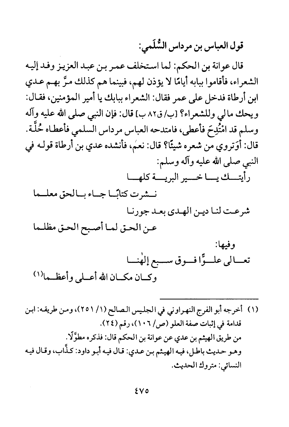 قال عوانة بن الحكم: لما استخلف عمر بن عبد العزيز وفد إليه الشعراء، فأقاموا ببابه أيامًا لا يؤذن لهم، فبينما هم كذلك مرَّ بهم عدي ابن أرطاة فدخل على عمر فقال: الشعراء ببابك يا أمير المؤمنين، فقال: ويحك ما لي وللشعراء؟ [ب/ق 82 ب] قال: فإن النبي صلى الله عليه وآله وسلم قد امْتُدِحَ فأعطى، فامتدحه العباس مرداس السلمي فأعطاه حُلَّة. قال: أوَ تروي من شعره شيئًا؟ قال: نعم، فأنشده عدي بن أرطاة قوله في النبي صلى الله عليه وآله وسلم: