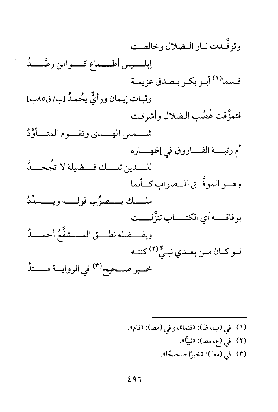 فسما (¬1) أبو بكر بصدق عزيمة ... وثبات إيمان ورأيٌّ يحُمدُ [ب/ ق 85 ب]