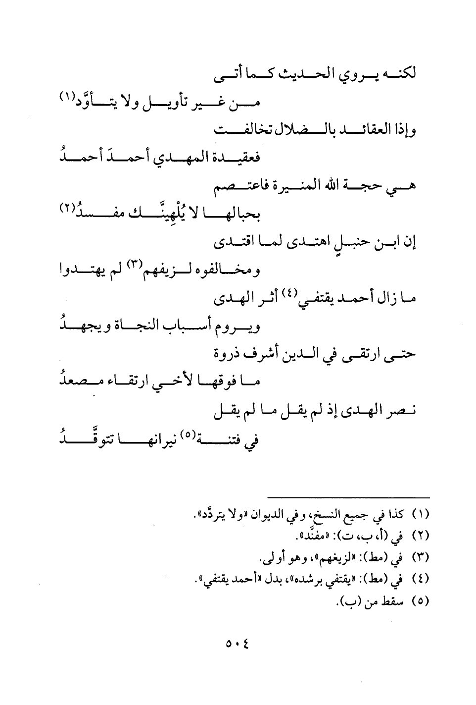 إن ابن حنبلٍ اهتدى لما اقتدى ... ومخالفوه لزيفهم (¬3) لم يهتدوا