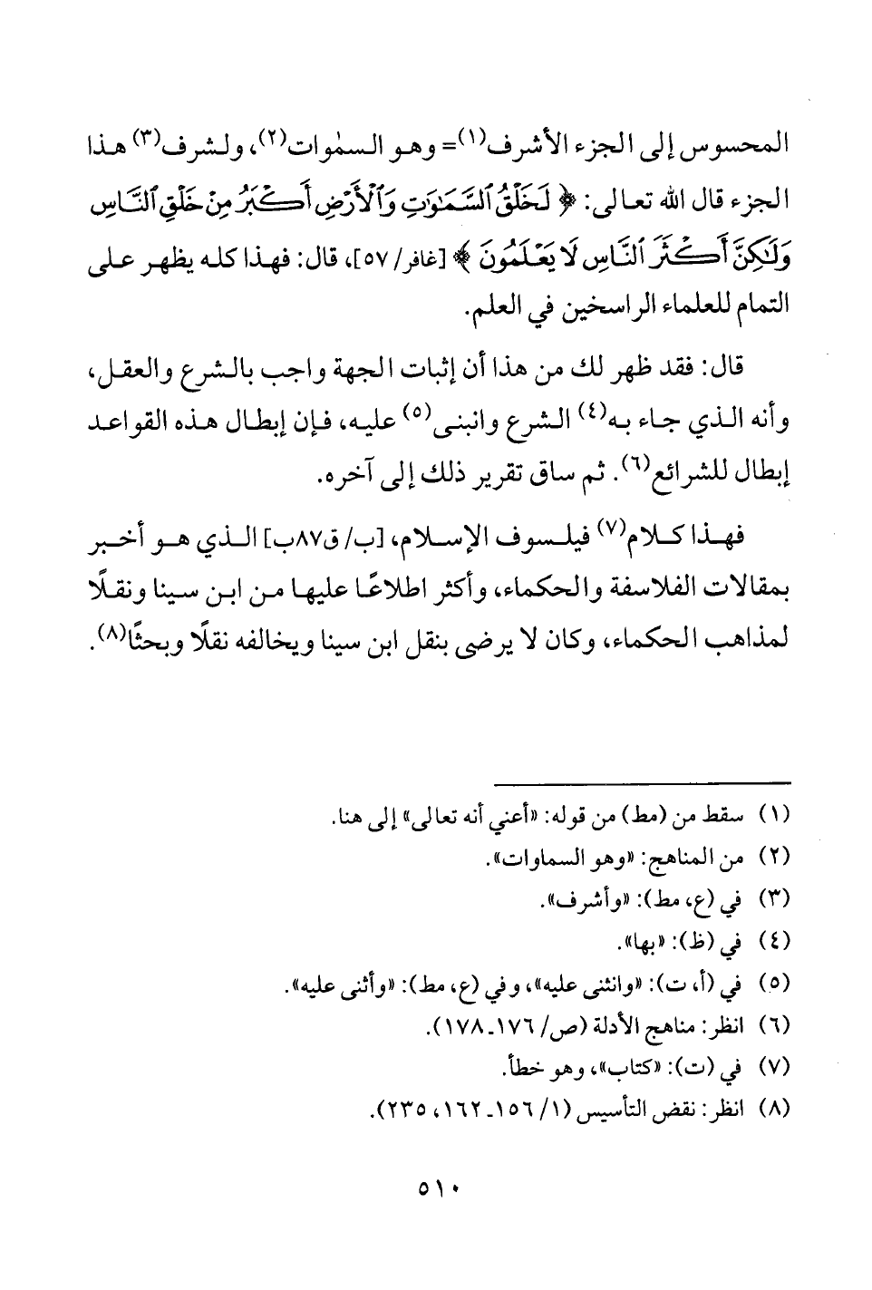 المحسوس إلى الجزء الأشرف (¬1) = وهو السماوات (¬2)، ولشرف (¬3) هذا الجزء قال الله تعالى: {لَخَلْقُ السَّمَاوَاتِ وَالْأَرْضِ أَكْبَرُ مِنْ خَلْقِ النَّاسِ وَلَكِنَّ أَكْثَرَ النَّاسِ لَا يَعْلَمُونَ} [غافر/ 57] , قال: فهذا كله يظهر على التمام للعلماء الراسخين في العلم.