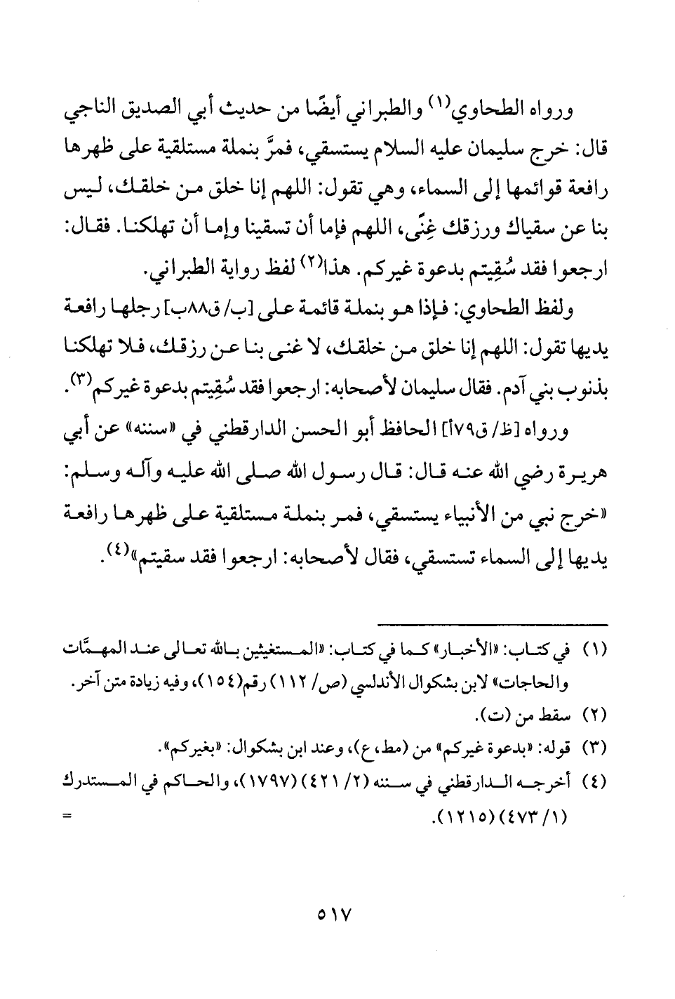 ورواه [ظ/ ق 79 أ] الحافظ أبو الحسن الدارقطني في "سننه" عن أبي هريرة رضي الله عنه قال: قال رسول الله صلى الله عليه وآله وسلم: "خرج نبي من الأنبياء يستسقي، فمر بنملة مستلقية على ظهرها رافعة يديها إلى السماء تستسقي، فقال لأصحابه: ارجعوا فقد سقيتم" (¬4).