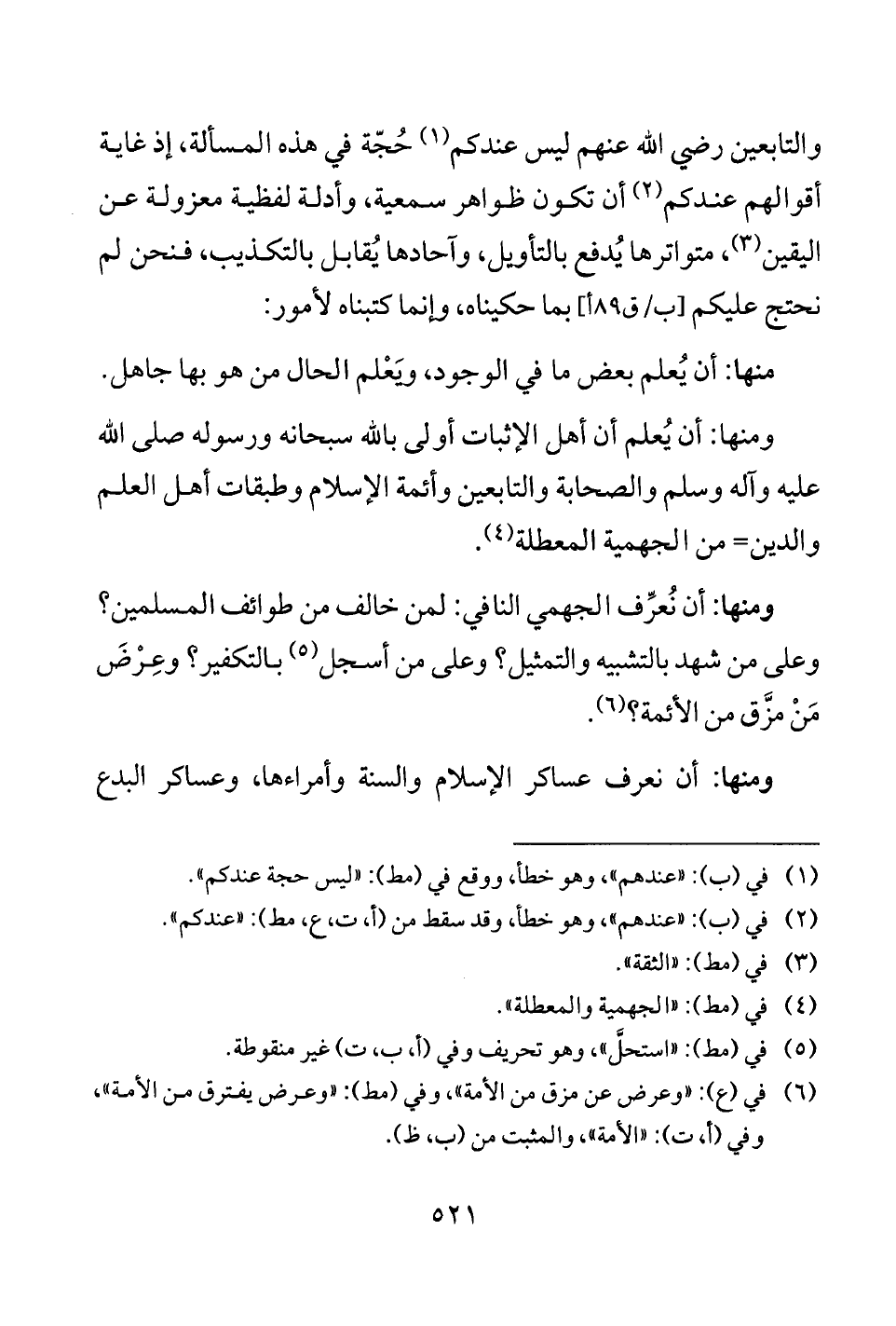 ومنها: أن نُعرِّف الجهمي النافي: لمن خالف من طوائف المسلمين؟ وعلى من شهد بالتشبيه والتمثيل؟ وعلى من أسجل (¬5) بالتكفير؟ وعِرْضَ مَنْ مزَّق من الأئمة؟ (¬6).