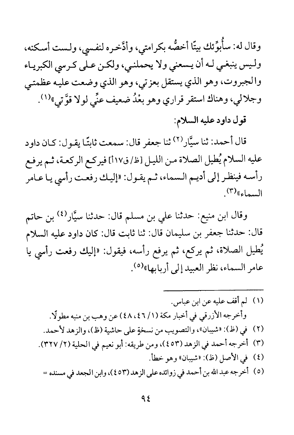 قال أحمد: ثنا سيَّار (¬2) ثنا جعفر قال: سمعت ثابتًا يقول: كان داود عليه السلام يُطيل الصلاة من الليل [ظ/ ق 17 أ] فيركع الركعة، ثم يرفع رأسه فينظر إلى أديم السماء، ثم يقول: "إليك رفعت رأسي يا عامر السماء" (¬3).
