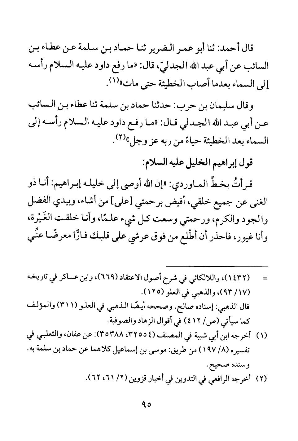 وقال سليمان بن حرب: حدثنا حماد بن سلمة ثنا عطاء بن السائب عن أبي عبد الله الجدلي قال: "ما رفع داود عليه السلام رأسه إلى السماء بعد الخطيئة حياءً من ربه عز وجل" (¬2).