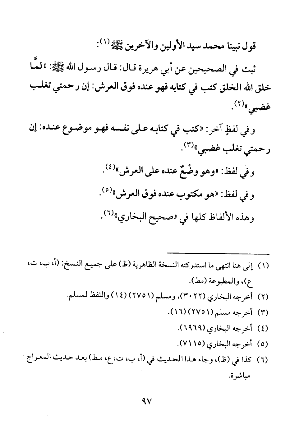 ثبت في الصحيحين عن أبي هريرة قال: قال رسول الله - صلى الله عليه وسلم -: "لمَّا خلق الله الخلق كتب في كتابه فهو عنده فوق العرش: إن رحمتي تغلب غضبي" (¬2).