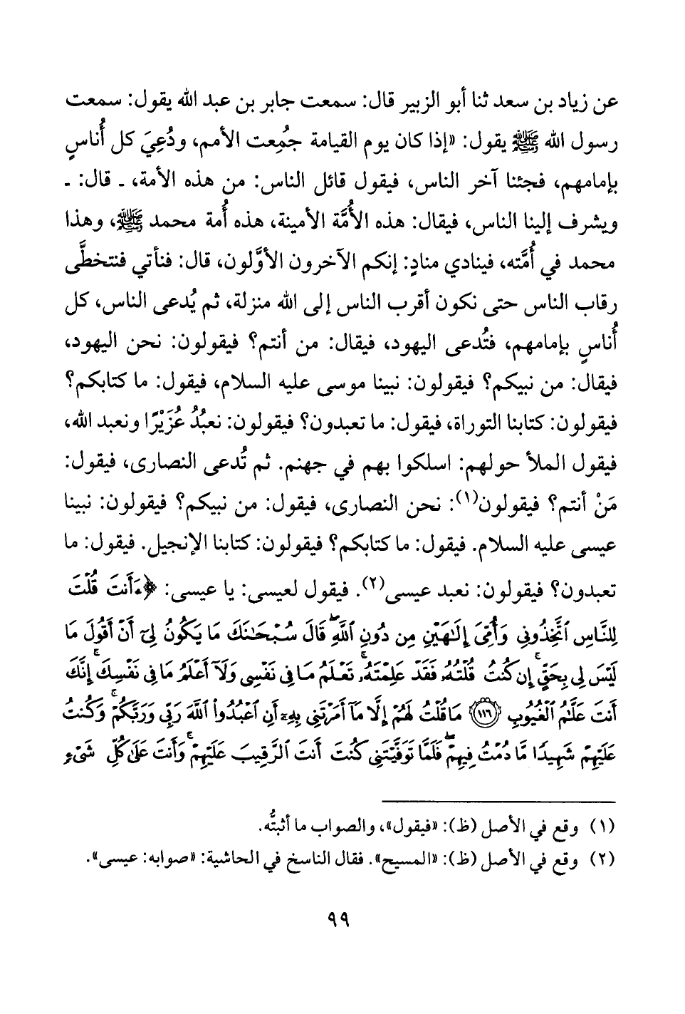 عن زياد بن سعد ثنا أبو الزبير قال: سمعت جابر بن عبد الله يقول: سمعت رسول الله - صلى الله عليه وسلم - يقول: "إذا كان يوم القيامة جُمِعت الأمم، ودُعِيَ كل أُناسٍ بإمامهم، فجئنا آخر الناس، فيقول قائل الناس: من هذه الأمة، - قال: - ويشرف إلينا الناس، فيقال: هذه الأُمَّة الأمينة، هذه أُمة محمد - صلى الله عليه وسلم -، وهذا محمد في أُمَّته، فينادي منادٍ: إنكم الآخرون الأوَّلون، قال: فنأتي فنتخطَّى رقاب الناس حتى نكون أقرب الناس إلى الله منزلة، ثم يُدعى الناس، كل أُناسٍ بإمامهم، فتُدعى اليهود، فيقال: من أنتم؟ فيقولون: نحن اليهود، فيقال: من نبيكم؟ فيقولون: نبينا موسى عليه السلام، فيقول: ما كتابكم؟ فيقولون: كتابنا التوراة، فيقول: ما تعبدون؟ فيقولون: نعبُدُ عُزَيْزًا ونعبد الله، فيقول الملأ حولهم: اسلكوا بهم في جهنم. ثم تُدعى النصارى، فيقول: مَنْ أنتم؟ فيقولون (¬1): نحن النصارى، فيقول: من نبيكم؟ فيقولون: نبينا عيسى عليه السلام. فيقول: ما كتابكم؟ فيقولون: كتابنا الإنجيل. فيقول: ما تعبدون؟ فيقولون: نعبد عيسى (¬2). فيقول لعيسى: يا عيسى: {أَأَنْتَ قُلْتَ لِلنَّاسِ اتَّخِذُونِي وَأُمِّيَ إِلَهَيْنِ مِنْ دُونِ اللَّهِ قَالَ سُبْحَانَكَ مَا يَكُونُ لِي أَنْ أَقُولَ مَا لَيْسَ لِي بِحَقٍّ إِنْ كُنْتُ قُلْتُهُ فَقَدْ عَلِمْتَهُ تَعْلَمُ مَا فِي نَفْسِي وَلَا أَعْلَمُ مَا فِي نَفْسِكَ إِنَّكَ أَنْتَ عَلَّامُ الْغُيُوبِ (116) مَا قُلْتُ لَهُمْ إِلَّا مَا أَمَرْتَنِي بِهِ أَنِ اعْبُدُوا اللَّهَ رَبِّي وَرَبَّكُمْ وَكُنْتُ عَلَيْهِمْ شَهِيدًا مَا دُمْتُ فِيهِمْ فَلَمَّا تَوَفَّيْتَنِي كُنْتَ أَنْتَ الرَّقِيبَ عَلَيْهِمْ وَأَنْتَ عَلَى كُلِّ شَيْءٍ