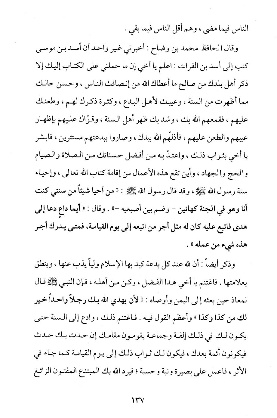 وقال الحافظ محمد بن وضاح: أخبرني غير واحد أن أسد بن موسى كتب إلى أسد بن الفرات: اعلم يا أخي إن ما حملني على الكتاب إليك إلا ذكر أهل بلدك من صالح ما أعطاك الله من إنصافك الناس، وحُسن حالك مما أظهرت من السنة، وعيبك لأهل البدع، وكثرة ذكرك لهم، وطعنك عليهم، فقمعهم الله بك، وشد بك ظهر أهل السنة، وقوّاك عليهم بإظهار عيبهم والطعن عليهم، فأذلهم الله بيدك، وصاروا ببدعتهم مستترين، فابشر يا أخي بثواب ذلك، واعتد به من أفضل حسناتك من الصلاة والصيام والحج والجهاد، وأين تقع هذه الأعمال من إقامة كتاب الله تعالى، وإحياء سنة رسول الله - صلى الله عليه وسلم -؟! وقد قال رسول الله - صلى الله عليه وسلم -: «من أحيا شيئا من سنتي كنت أنا وهو في الجنة كهاتين، وضم بين أصبعيه»، وقال: «أيما داع دعا إلى هدى فاتبع عليه كان له مثل أجر من اتبعه إلى يوم القيامة، فمتى يدرك أجر هذه شيء من عمله».