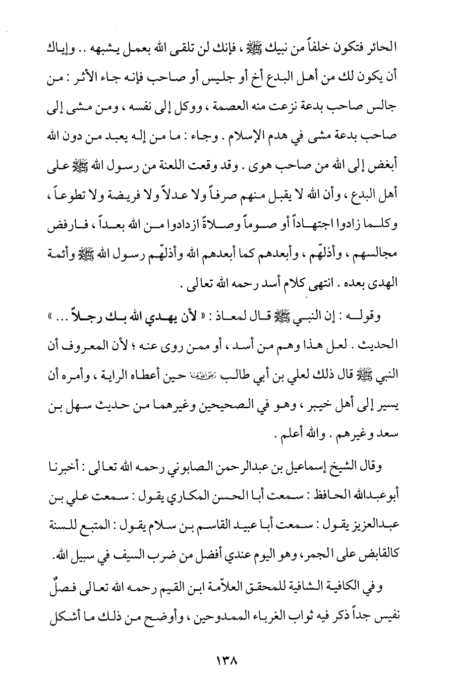 وقال الشيخ إسماعيل بن عبد الرحمن الصابوني رحمه الله تعالى: أخبرنا أبو عبد الله الحافظ: سمعت أبا الحسن المكاري يقول: سمعت علي بن عبد العزيز يقول: سمعت أبا عبيد القاسم بن سلام يقول: المُتَّبع للسنة كالقابض على الجمر، وهو اليوم عندي أفضل من ضرب السيف في سبيل الله.
