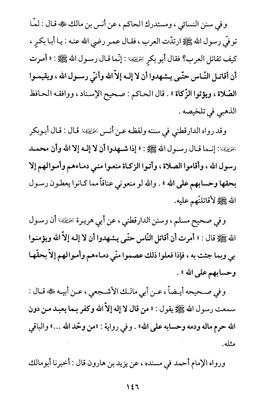 وفي سنن النسائي، ومستدرك الحاكم، عن أنس بن مالك - رضي الله عنه - قال: لما توفّي رسول الله - صلى الله عليه وسلم - ارتدّت العرب، فقال عمر - رضي الله عنه -: يا أبا بكر، كيف تقاتل العرب؟ فقال أبو بكر - رضي الله عنه -: إنما قال رسول الله - صلى الله عليه وسلم -: «أمرت أن أقاتل الناس حتى يشهدوا أن لا إله إلا الله وأني رسول الله، ويقيموا الصلاة، ويؤتوا الزكاة»