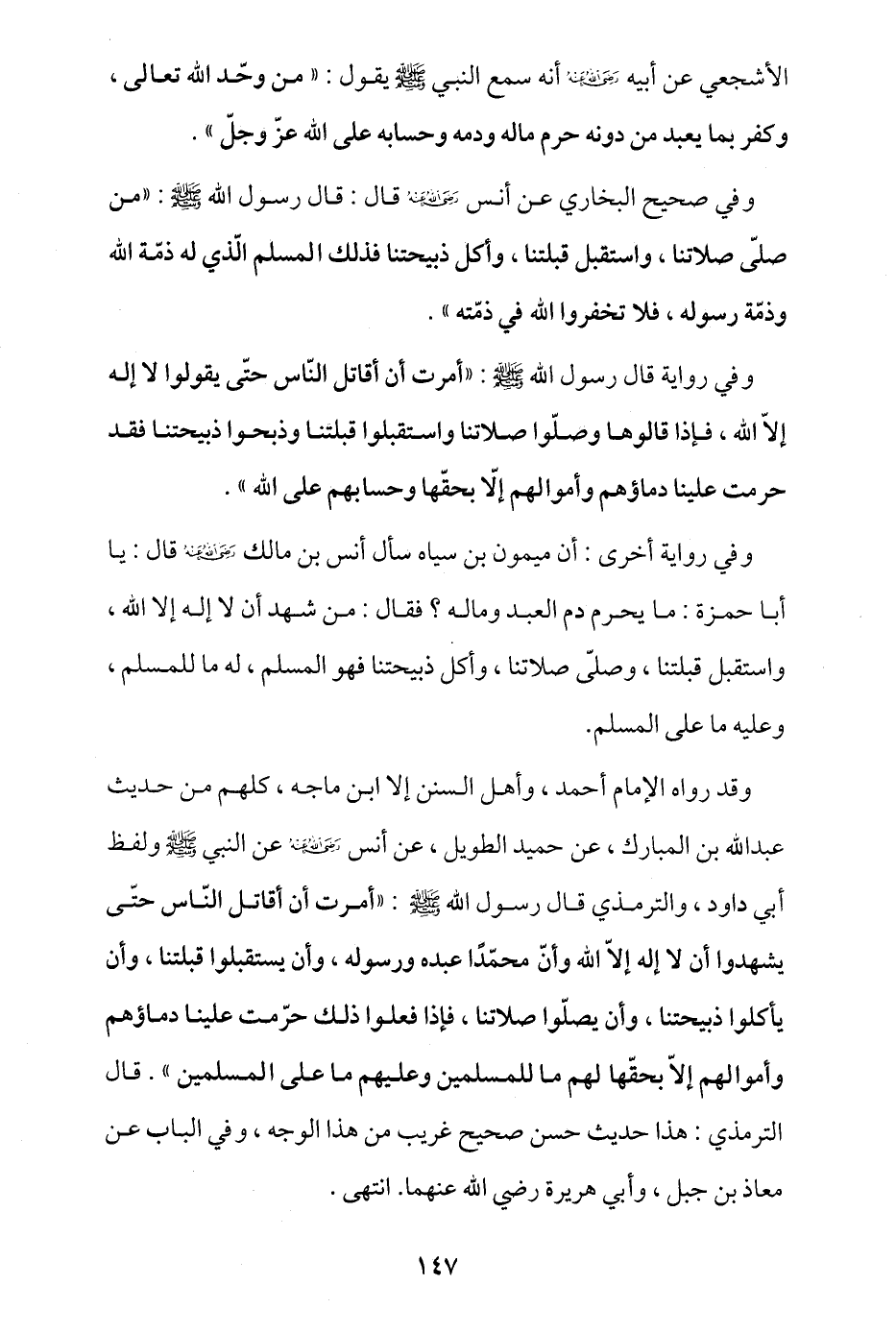 وقد رواه الإمام أحمد، وأهل السنن إلا ابن ماجة، كلهم من حديث عبد الله بن المبارك، عن حميد الطويل، عن أنس - رضي الله عنه - عن النبي - صلى الله عليه وسلم - ولفظ أبي داود، والترمذي قال رسول الله - صلى الله عليه وسلم -: «أمرت أن أقاتل الناس حتى يشهدوا أن لا إله إلا الله وأن محمدا عبده ورسوله، وأن يستقبلوا قبلتنا، وأن يأكلوا ذبيحتنا، وأن يصلوا صلاتنا، فإذا فعلوا ذلك حُرِّمت علينا دماؤهم وأموالهم إلا بحقها، لهم ما للمسلمين وعليهم ما على المسلمين» قال الترمذي: هذا حديث حسن صحيح غريب من هذا الوجه، وفي الباب عن معاذ بن جبل، وأبي هريرة رضي الله عنهما. انتهى.