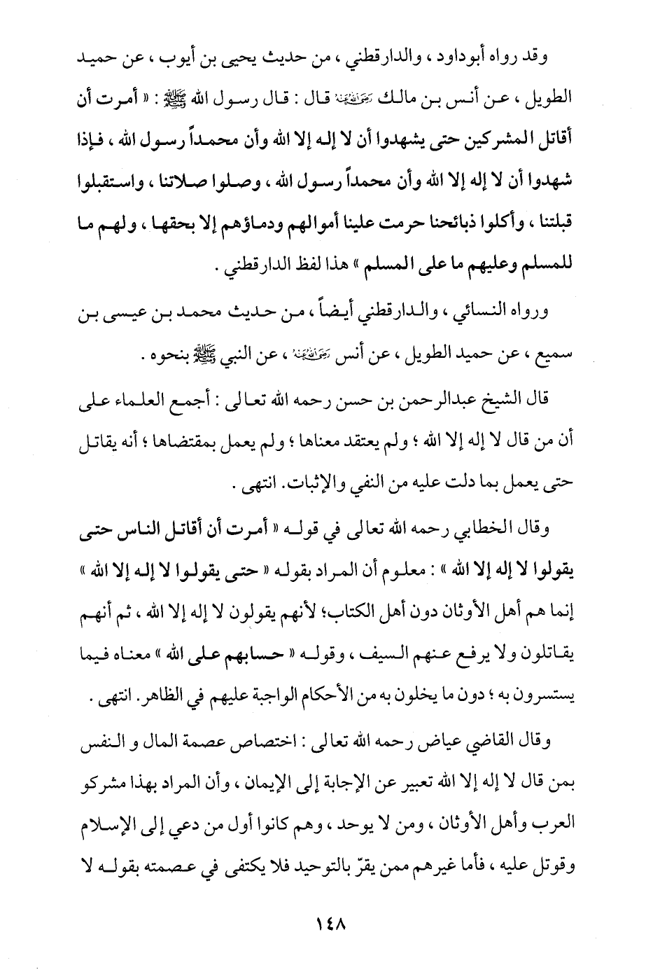 وقد رواه أبو داود والدارقطني، من حديث يحيى بن أيوب، عن حميد الطويل، عن أنس بن مالك - رضي الله عنه - قال: قال رسول الله - صلى الله عليه وسلم -: «أُمرت أن أقاتل المشركين حتى يشهدوا أن لا إله إلا الله وأن محمدا رسول الله، فإذا شهدوا أن لا إله إلا الله وأن محمدا رسول الله، وصلوا صلاتنا، واستقبلوا قبلتنا، وأكلوا ذبائحنا حُرِّمت علينا أموالهم ودماؤهم إلا بحقها، ولهم ما للمسلم وعليهم ما على المسلم» هذا لفظ الدارقطني.