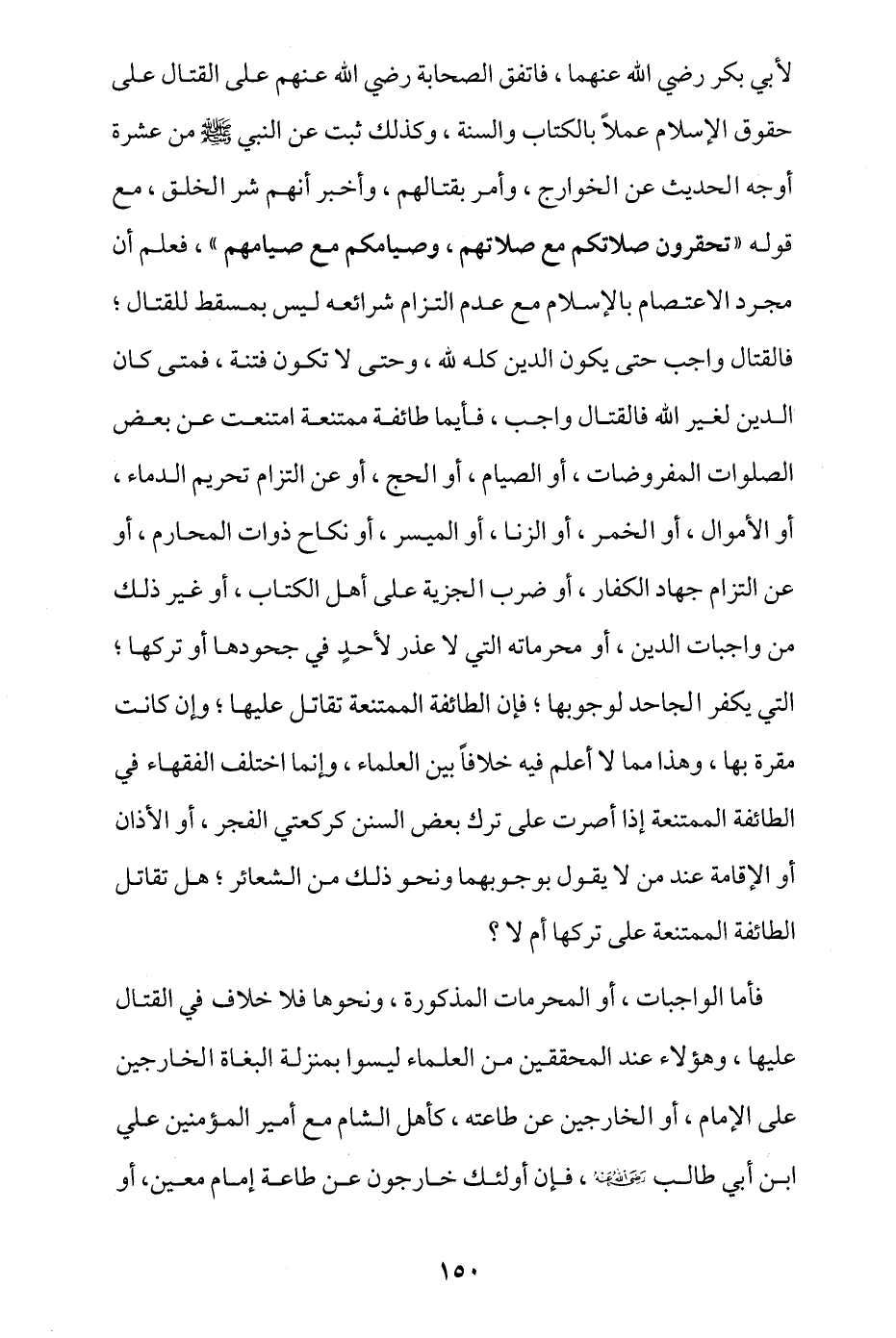 لأبي بكر رضي الله عنهما، فاتفق الصحابة - رضي الله عنهم - على القتال على حقوق الإسلام عملا بالكتاب والسنة، وكذلك ثبت عن النبي - صلى الله عليه وسلم - من عشرة أوجه الحديث عن الخوارج، وأمر بقتالهم، وأخبر أنهم شر الخلق، مع قوله: «تحقرون صلاتكم مع صلاتهم، وصيامكم مع صيامهم»، فعلم أن مجرد الاعتصام بالإسلام مع عدم التزام شرائعه ليس بمُسقط للقتال، فالقتال واجب حتى يكون الدين كله لله، وحتى لا تكون فتنة، فمتى كان الدين لغير الله فالقتال واجب، فأيُّما طائفة ممتنعة امتنعت عن بعض الصلوات المفروضات، أو الصيام، أو الحج، أو عن التزام تحريم الدماء، أو الأموال، أو الخمر، أو الزنا، أو الميسر، أو نكاح ذوات المحارم، أو عن التزام جهاد الكفار، أو ضرب الجزية على أهل الكتاب، أو غير ذلك من واجبات الدين، أو محرماته التي لا عذر لأحد في جحودها أو تركها، التي يكفر الجاحد لوجوبه، فإن الطائفة الممتنعة تقاتل عليها، وإن كانت مقرة بها، وهذا مما لا أعلم فيه خلافا بين العلماء، وإنما اختلف الفقهاء في الطائفة الممتنعة إذا أصرت على ترك بعض السنن كركعتي الفجر، أو الأذان أو الإقامة عند من لا يقول بوجوبهما ونحو ذلك من الشعائر، هل تقاتل الطائفة الممتنعة على تركها أم لا؟